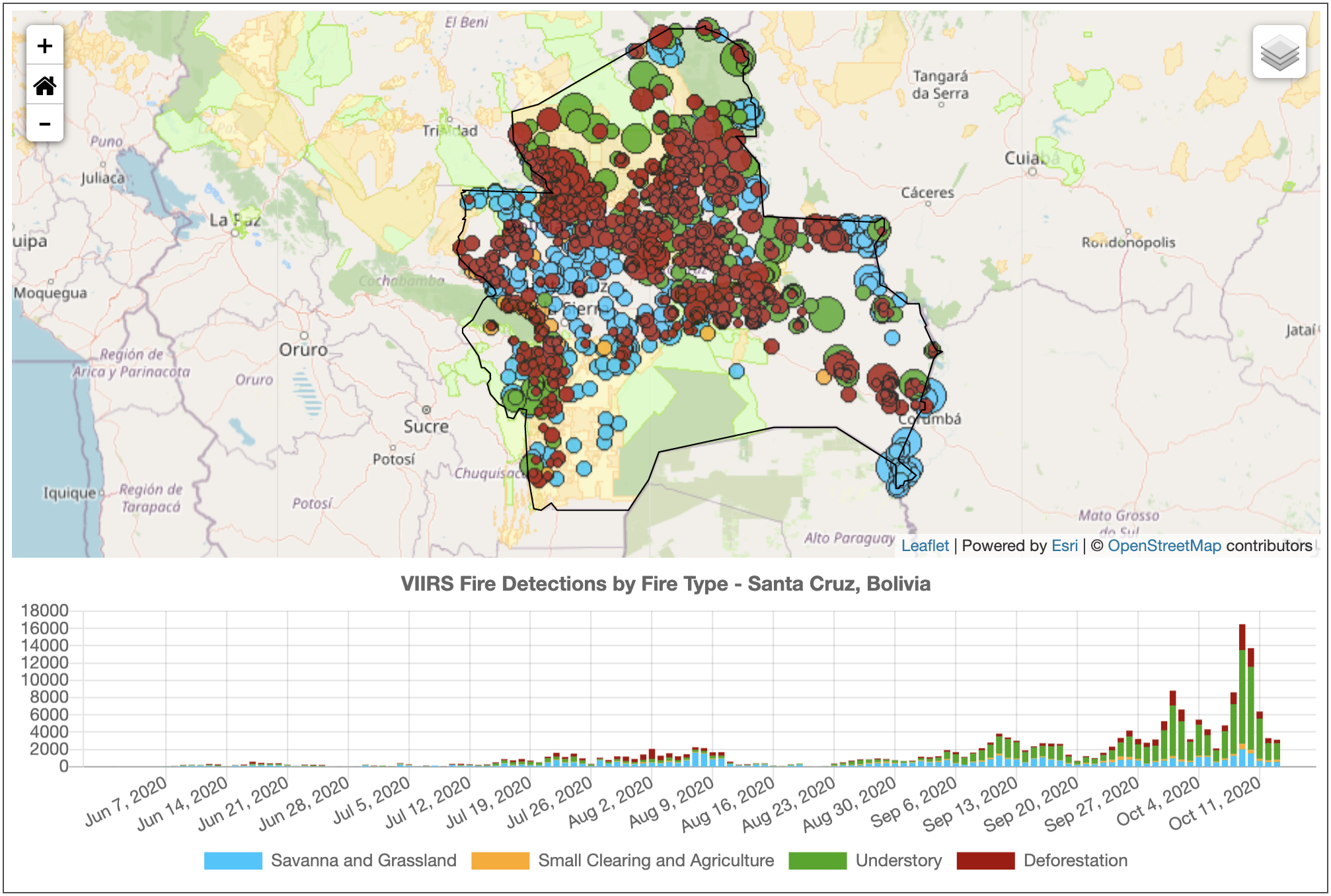 Sensors on NASA and NOAA satellites – including the Moderate Resolution Imaging Spectroradiometer (MODIS) and Visible Infrared Imaging Radiometer Suite (VIIRS) – map where fires are actively burning on Earth each day. For instance, the map from NASA’s Fire Information for Resource Management System (FIRMS) below shows all of the fire detections in Bolivia that VIIRS observed on October 16, 2020.