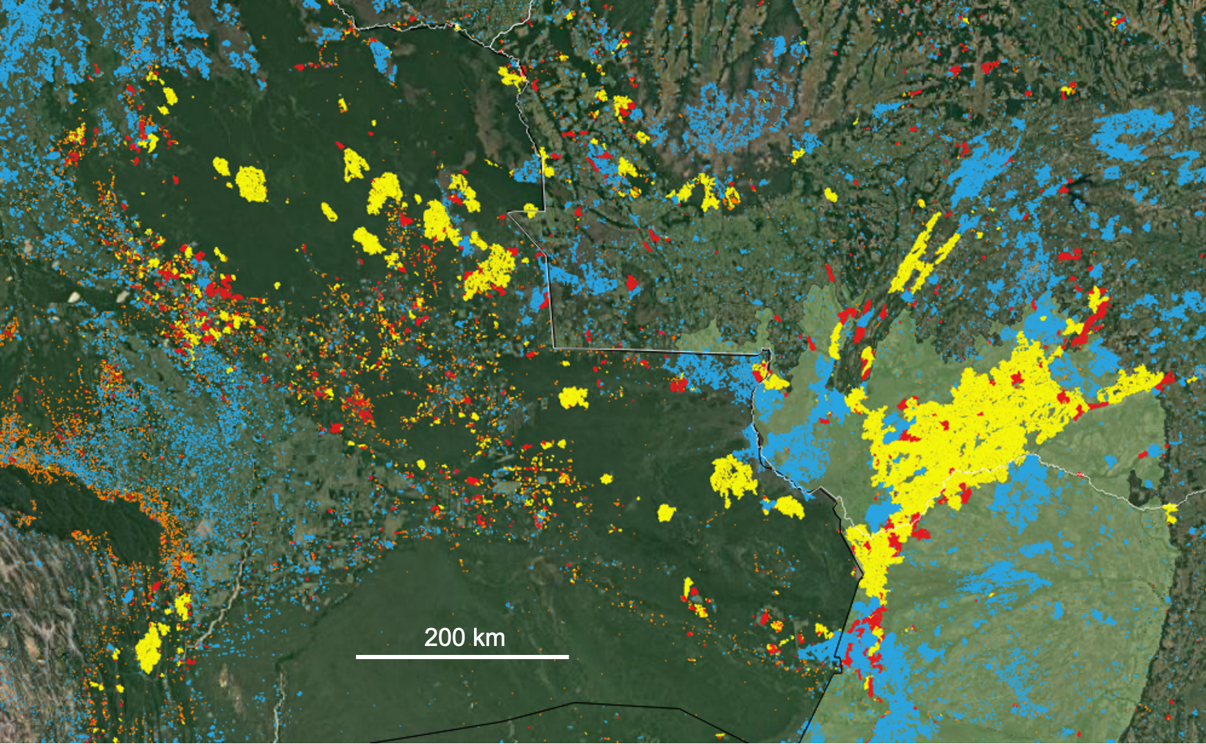 On the other hand, some of those red dots are long-lasting, intense deforestation fires that were lit specifically to burn trees as part of land-clearing processes. These fires turn patches of tropical forests into pasture or cropland, fragmenting the remaining forests and altering ecosystems for decades.