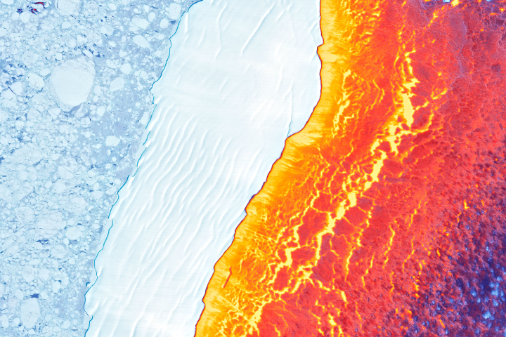 Update on March 22, 2022: This puzzler image shows Iceberg D-30A drifting amid sea ice in Antarctica’s Weddell Sea. The false-color image was created by blending data from the Landsat 8 satellite’s satellite’s Operational Land Imager (for detail and texture) and its Thermal Infrared Sensor (TIRS). The warmest areas (yellow, orange, and red) depict open water and thin, newly formed sea ice. The coldest areas (blue and white) are older, thicker ice, including the icebergs and broken ice rubble in their paths. Congratulations to Jan Lieser who correctly identified the iceberg and various sea ice types. Honorable mention goes to Sergio Vidal-Luengo and Veronica Zapata for correctly identifying the thermal component of the image. Read more in the related Image of the Day. Every month on Earth Matters, we offer a puzzling satellite image. The March 2022 puzzler is shown above. Your challenge is to use the comments section to tell us where it is, what we are looking at, and why it is interesting.