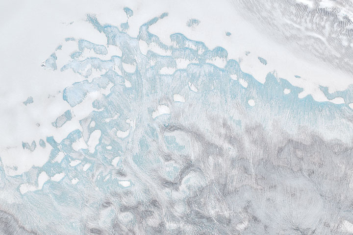 Update on August 5, 2022: This puzzler image shows a portion of Nordaustlandet—a large island in northeast Svalbard. The image was acquired after a record amount of melting took place across the Norwegian archipelago in summer 2022. Notice the extensive light-blue areas where snow and firn have melted away and exposed bare ice (light blue). Congratulations to Yoshihiro Nakayama, who correctly identified the location. Special mention goes to Soren J and others for pointing features associated with melting. Read more in the related Image of the Day.
