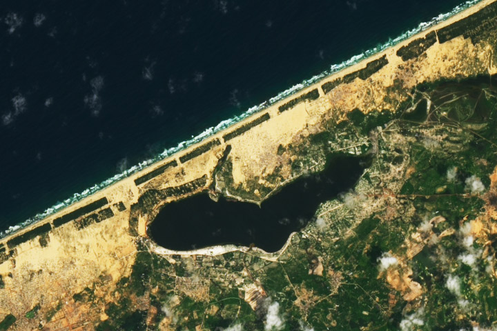 Update on October 26, 2022: This puzzler image shows Lake Retba along the coast of Senegal. The lake’s water’s are often rosy, but had darkened by the time this image was acquired in September 2022 after bouts of heavy rainfall and flooding. Congratulations to Keith Trinity, who was the first to correctly identify the lake and its location. Special mention goes to Rakhee Ranjan for pointing out the intense monsoon season in 2022 and other facts about the region. Read more in the related Image of the Day.