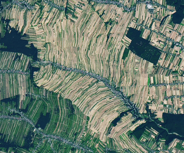 Update on March 19, 2025: This Landsat image shows fields in southern Poland that have taken on ribbon-like shapes after generations of land division. Congratulations to Annie Burgess for being the first reader to identify the location. Special recognition goes to Yaakov Gewargis for the most colorful description. Read more about the area in “Farming on the Straight, Curved, and Narrow.”