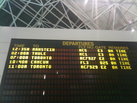 So, our trip began at Baltimore Washington International Airport just a short 30 minute drive from my home. We piled our three children into the car, and my wife Anne drove Eric and I to the airport at 9 p.m. We showed up at the Military Airlift Command, to a fairly empty airport, and one of the easiest check-in process I have ever experienced traveling. We then searched out some food to wait for our 2 a.m. flight departure, and we ran into the rest of the party traveling to Thule with us. It was great linking up with the rest of the “first wave” of IceBridge team members. A majority of the team will be arriving via the P-3 aircraft next week on Monday. 2 a.m. arrived and we boarded the DC-8 chartered aircraft for the 5 hour and 45 minute flight due north to Greenland.