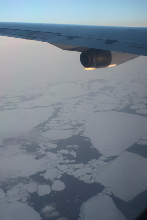 The flight was comfortable, although a bit chilly at times. It was similar to a commercial airline, however, it was primarily a cargo mission, with most of the plane consisting of a large cargo hold and with only 30 seats situated towards the rear of the aircraft. I was able to sleep for some part of the flight (remember it was VERY early in the morning!) However, I was gratefully woken up by a strong beam of sunlight as the sun rose through the window across from me. This was a pleasant surprise, because as I looked out my window I saw a beautiful sight. Large sea ice floes creating a seascape like one I have never seen before. I began snapping pictures for the remainder of the flight. Each minute the area of ocean below us was constantly changing. It would be completely covered in ice, then only several floes. Large cracks or leads, different stages of ice formation, open water, icebergs, and even sea smoke (or low clouds) forming over the relatively warm ocean and VERY cold air above. It was truly breathtaking!