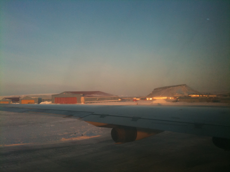 We landed at approximately 9 a.m. local (a 1-hour time advance), to some more great scenery. Once the coastline of Greenland was spotted, we were already on final approach. This was another landscape that I have never experienced before. The Greenland Ice Sheet was directly below us, mountains went right to the ocean, glaciers flowing between peaks, ending in a field of broken up icebergs floating just offshore stuck in the ice. We were only over land for a few minutes before Thule Air Force Base was in sight. We rounded Mt. Dundas and landed smoothly on the white ice-covered runway. A short taxi to the terminal and we stepped out into the bone-chilling minus 25 degree weather. Instantly the moisture inside my nose froze. It was a very interesting feeling. Once inside the terminal, the base commander and his leadership team greeted us (as we were the only flight in for the week), and instantly made us feel at home. We are excited to explore the base and take in as much of the Thule experience while we have the opportunity before we get involved with the IceBridge flights scheduled to begin on Tuesday.