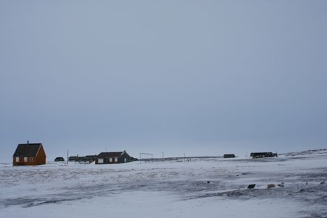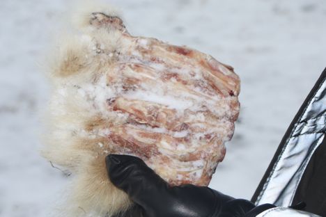 The wind was only about 10 or 15 knots, but right in our faces, which made any exposed skin very uncomfortable. We had our facemasks pulled up covering every last portion as we followed recent dog sled tracks towards the hunting village.  When we arrived (approximately 45 minutes) it was eerily quiet, as we hadn’t noticed any motion during our walk across the frozen bay. There were no signs of recent activity, minus LOTS of sled dog droppings, and a polar bear paw, with its fur and claws ripped from it.  We found it strangely odd that just this one paw was left behind with no other signs of anything, so we took a few photos, and put it back where we found it.
