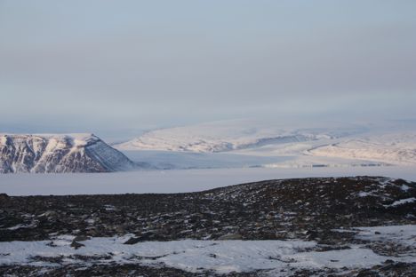 We explored the dozen or so huts, and decided to climb the small incline past the village to see what was on the other side. What a site! Another frozen body of water was in front of us, but this time three large Icebergs were within walking distance. We decided to hike out to the nearest one and got some good photos climbing to the top. At this point we were outside for about two and half hours, and we graciously took the offer of a Danish couple, who was out for a sightseeing drive, for a ride back to base. They were very pleasant, and shared all sorts of neat information about what it is like to live in Greenland. He was a firefighter and EMT, and has been here for over three years and she has been here just over a year and was a physical therapist on base. They brought us up towards the BMEWS (Ballistic Missile Early Warning System more on this in a later post), and to some great vantage points over looking the Wolstenholme fjord. This is the only place in the world where four glaciers combine into one fjord, it was an amazing view!