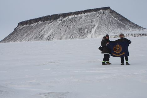 LCDR John Woods and MIDN Eric Brugler stand in front of Mt. Dundas in Thule, Greenland. Credit: John Woods