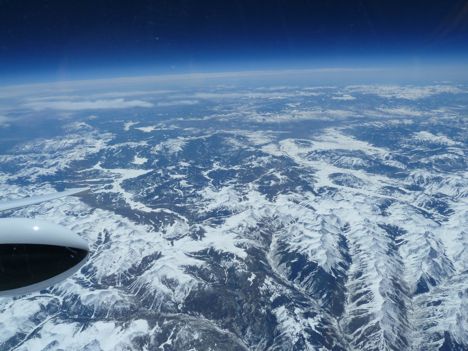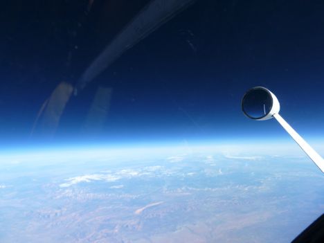 The pictures (above and below) were taken from 65,000 feet above sea level. At this elevation, you can clearly see the curvature of the earth. Additionally, you can see the thinning of the atmosphere (apparent in the change in color of the sky from light blue to dark blue).