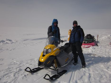Each day we traveled to a new site in the area around Swiss Camp and set up a new GPS station on the ice sheet. We looked a bit like an Arctic version of the Beverly Hillbillies with Tom puttering the snowmobile out of camp pulling a big red sled piled up with boxes, bags, shovels, more boxes, pipes, solar panels, more pipes, and me precariously perched on top of it all. We crawled around at about 10 miles per hour to avoid rattling my teeth too much, especially when the wind has sculpted the blowing snow into crusty dunes called sastrugi. Our commute typically took about an hour which can be relaxing if the snow is soft and the weather is sunny and calm, or exhausting when it is windy and bumpy.