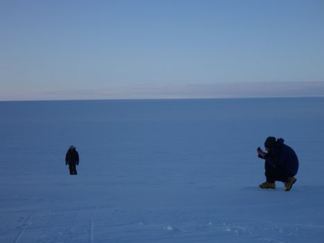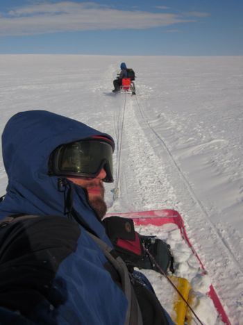 Even with GPS, traveling across the snow covered ice sheet can be disorienting under heavy cloud cover when the light is flat and the horizon disappears into a monotonous world of white in all directions. In those conditions, bumps in the snow are only apparent after you have driven over them too fast, and it’s really hard to tell how big anything is. One afternoon I was driving home in poor light, and about half way back I swore there was a little bug flying along side of the snowmobile. My initial (perhaps irrational) thought was that a fly had somehow been blown up onto the ice sheet and happened to be going the same way we were going. I was so convinced by what my eyes were telling me that I started to speed up to keep pace with the intrepid little guy who miraculously was cruising along at about 13 mph. After about a minute of this nonsense, my depth perception instantly snapped into place, and I realized that the fly was actually the GPS station we had set out the day before, about a half mile off in the distance. That night after dinner, Tom regaled us with stories of poor light in Antarctica that was so bad that you could hardly tell which way was up or if you were even moving!
