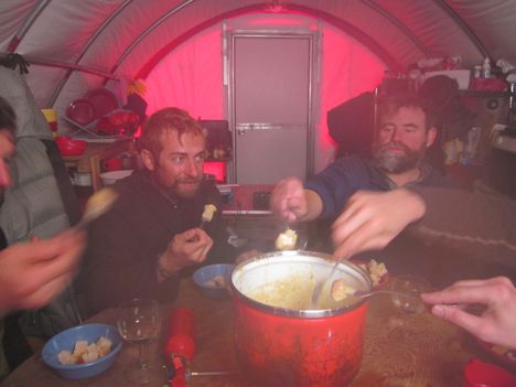 The tents consist of several layers of insulating material stretched over a frame of arched steel poles. A propane heater in each keeps the temperature inside comfortable, even when it is cold and snowy outside. One of the tents is set up as a kitchen and dining area, while the other serves as the workshop. Each season additional tents are pitched for each person to sleep in, and lines of cargo stretch out from camp, creating a small town radiating out from the main tents. The camp is typically powered by solar panels and a battery bank, though the storm this year knocked down the solar panels. Koni will no doubt have them up and running again shortly. Duties are shared, with everyone pitching in to help cook (yes, even me!), and keep the camp running. Snow is gathered from upwind of the camp for drinking water, while Koni brings the supply of food for the camp each year.