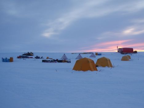 Sunrise at Swiss Camp. The small tents are our sleeping quarters, while the cargo line and the snowmobiles are down wind. Credit: NASA/Tom Neumann