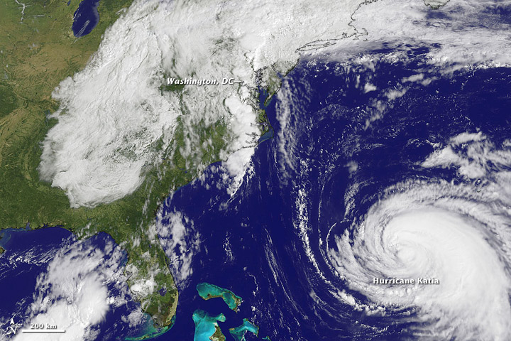 The remnants of Lee became merged with a stalled frontal system as Hurricane Katia was pushing north and west over the Atlantic Ocean, blocking Lee from escaping eastward and moving offshore. The winds from Lee and Katia pulled large amounts of moisture from the Gulf of Mexico and the Atlantic. The remnants of Lee dumped torrential rain as it plodded northward – weekly rainfall totals topped 10 inches across eight states. Elizabethtown, Pennsylvania recorded 15.37 inches for the week and the unofficial total at my home, south of Annapolis, Maryland, was 14 inches. The region had already been soaked by the rain from Hurricane Irene the week before, and the ground could not absorb the water. Rivers overflowed and in some areas, flooding was intense.