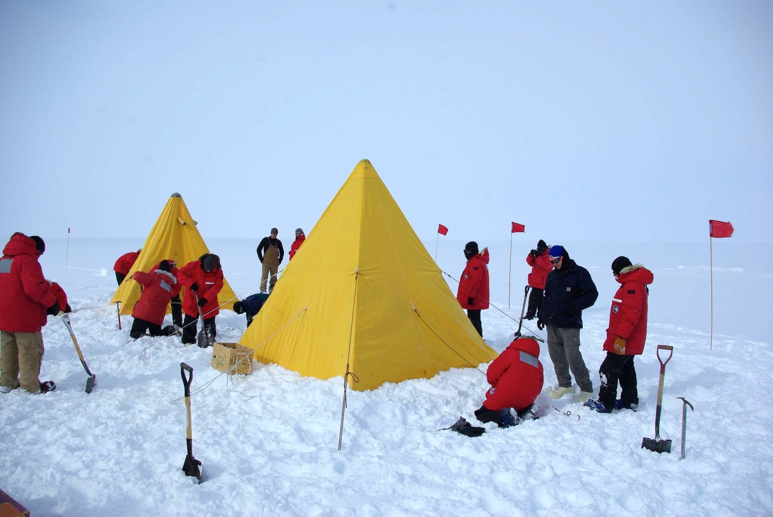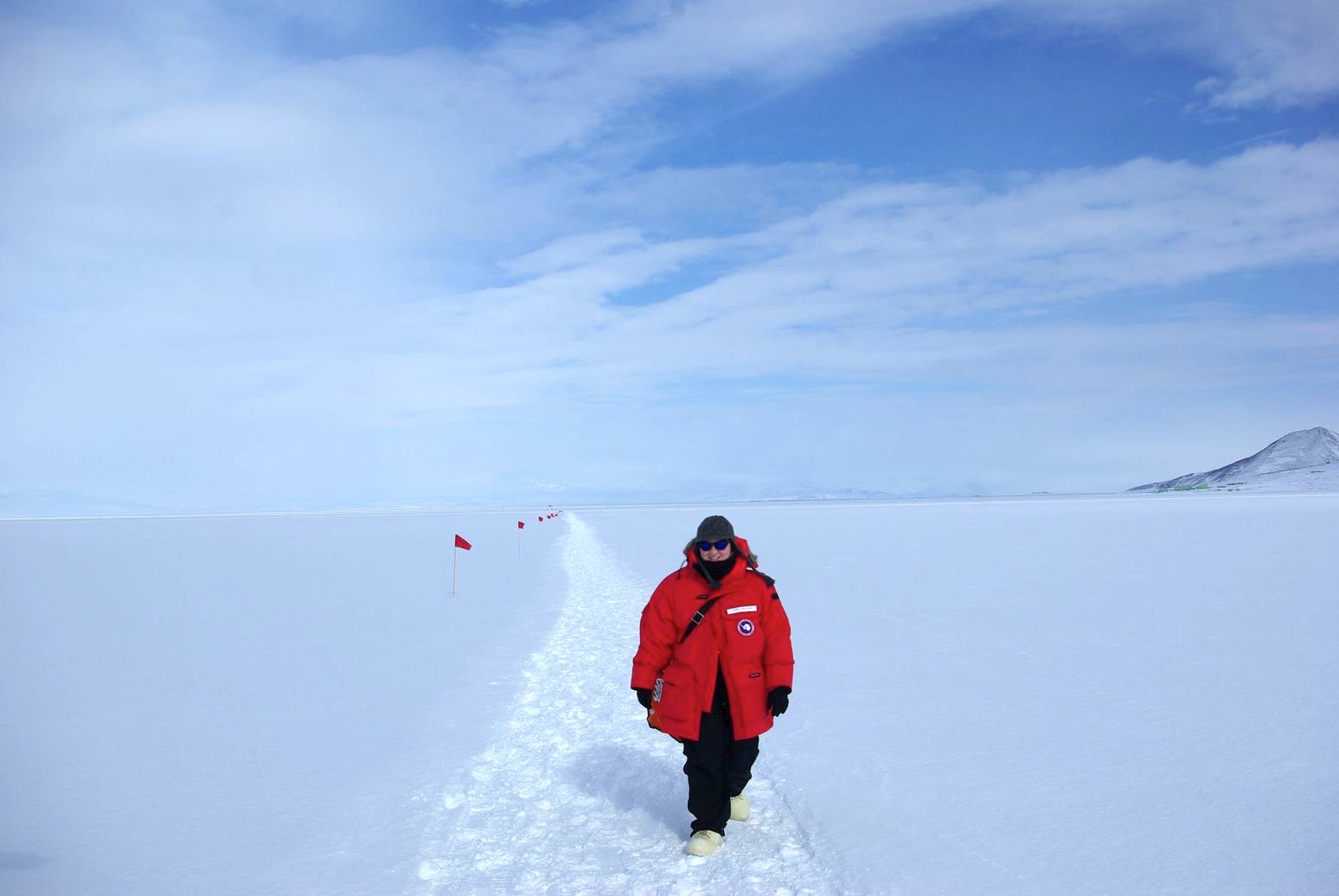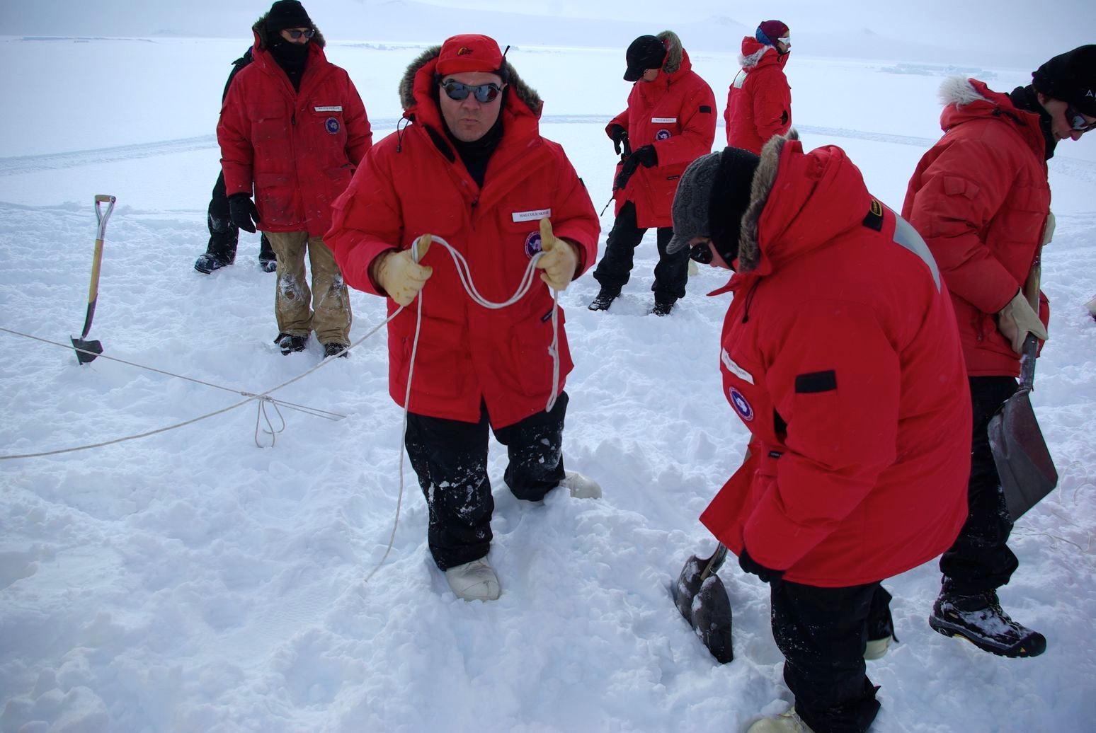 On Monday evening (Nov. 22), I had carefully prepared my ECW++ pack (the ++ stands for water and food). My ECW gear consisted of: socks, bottom and top thermal base- and mid-layers, a fleece jacket, a thick bib, Big Red, boots, and all the basics (such as hat, gloves and glove liners, mittens, face protection, etc). Additionally, we took the sleep kits and tents that we will be using during our traverse. These last two are very similar to the ones you most probably use when camping, but the sleeping bag is much thicker and we also use pads, a fleece liner, warm fleece pants, and a pee-bottle. Our bag also contained other basic and mandatory items, such as sunglasses, goggles, sunscreen, lipstick, and water bottles, among other things.