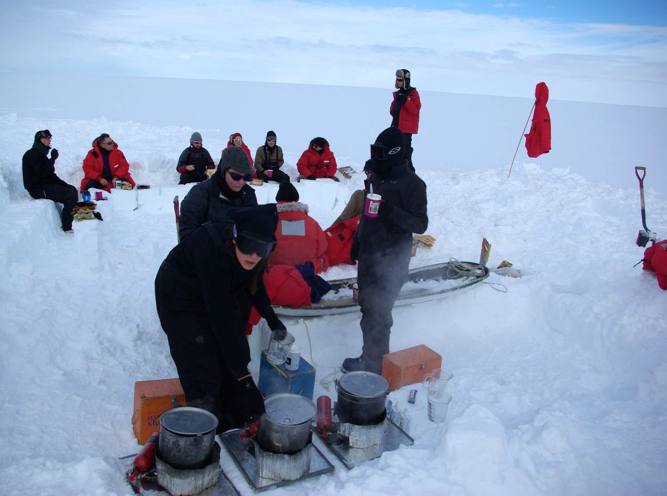 My night was perfect: cozy and unbelievably quiet! I didn’t even notice that the wind had started to blow strongly during the night. I woke up around 4 AM feeling a bit chilly; I ate a chocolate bar, drank some water, and went back to sleep. It was interesting to wake up in the middle of the night and be able to see like if it was day time. At this time of the year in Antarctica, all nights are bright, with only one star in the sky. It felt weird to be sleeping in a snow trench only three weeks after having slept in a hammock hung between palm trees in Big Island, Hawaii. Thanks Lora and Thorsten for these two experiences!