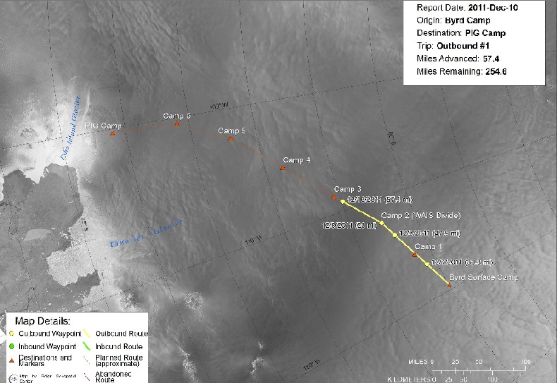 Tying up these loose ends didn’t add much weight to our overall cargo load, but we knew we were going to be heavier than we had planned for because there were some heavy items that failed to make it on flights to Byrd Station, where the over snow traverse was going to be taking them to the main camp at Pine Island. These problems originated way back in early September: Early season weather in West Antarctica was worse than usual, which meant fewer flights to Byrd and less of our cargo getting there when the traverse needed to start. Without sufficient cargo, the traverse managers held their departure back a few days. When they tried to start, one of the large tractors failed, leaving them with only three. This actually worked out better, since there was less cargo to pull. Now we hear that the traverse is encountering soft snow, slowing its progress even more. The image below is a map of the traverse’s progress through last night. It’s averaging less than 4.5 miles per hour and under 60 miles per day: At this rate, it will be another five days before it arrives at PIG.