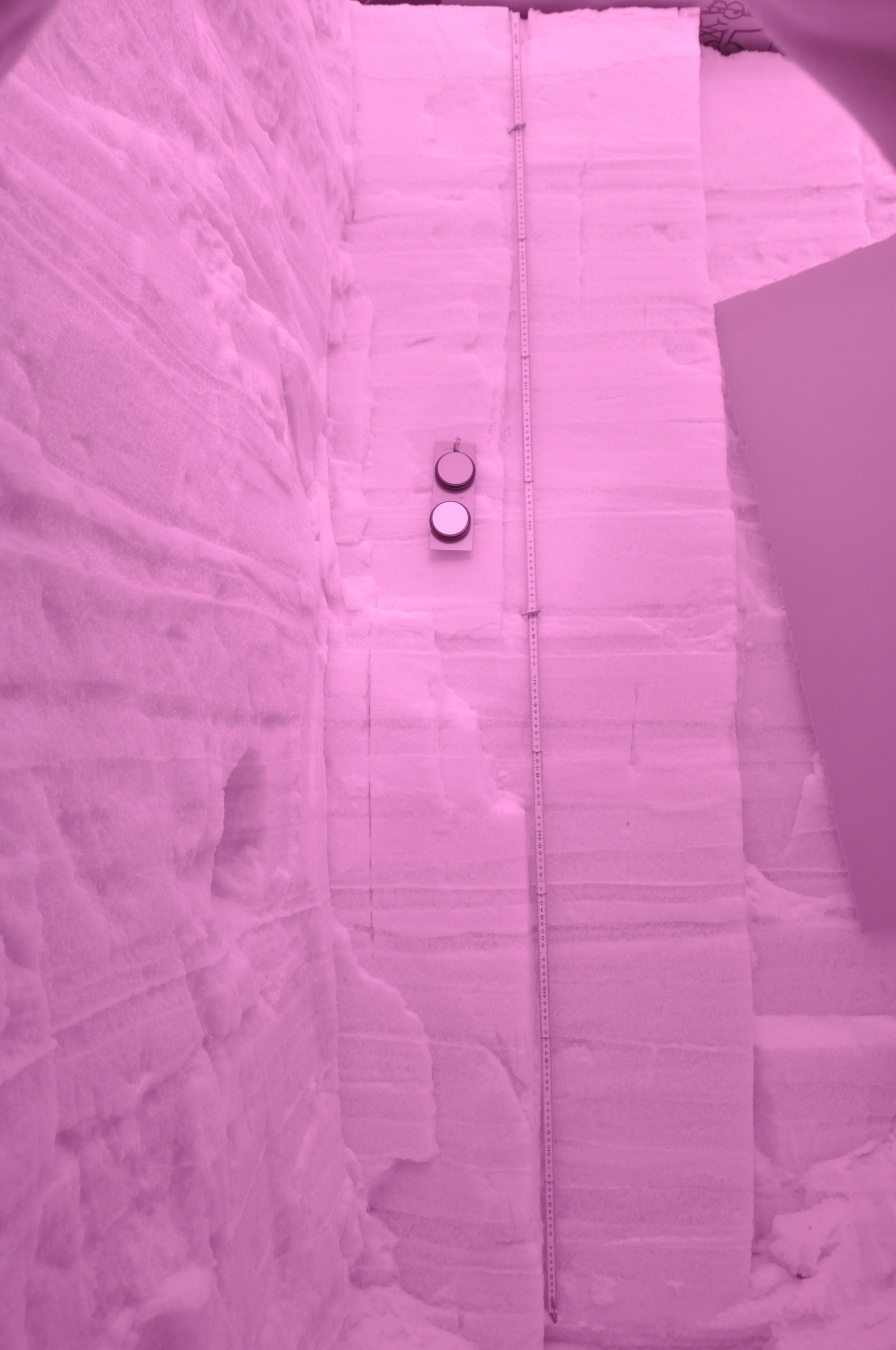 These photographs are used to calculate the grain size given the different reflectance levels of the infrared radiation. The photos are pink because they are taken in the infrared wavelength, not visible light like most cameras do. They are also very pretty to look at and you can see all of the layers of snow. Each storm puts down a new layer of snow. There was a new layer approximately every 6 cm (2.36 in) in this pit. There were more layers than I have ever seen before in a pit, which made the pit measurements take such a long time.