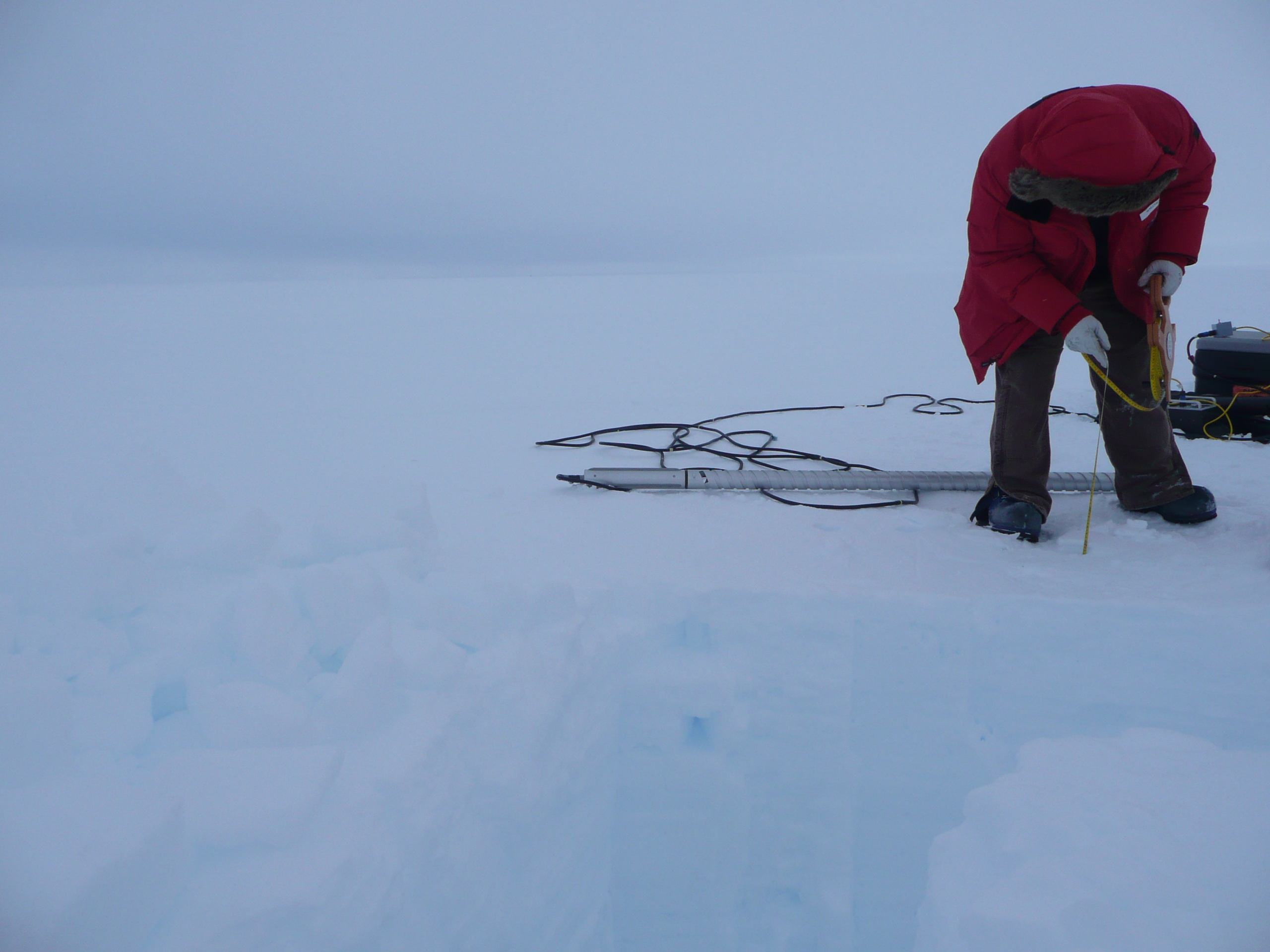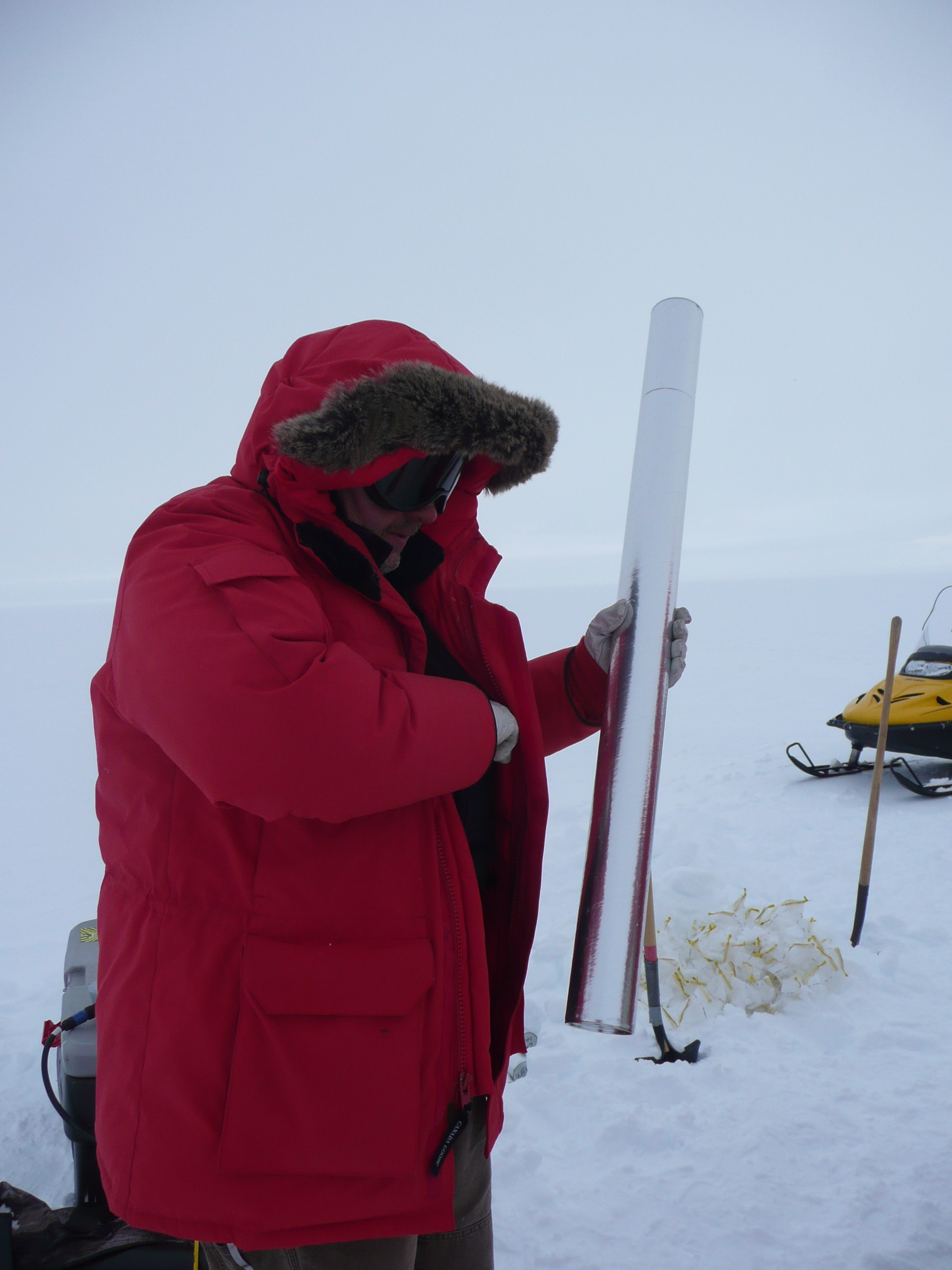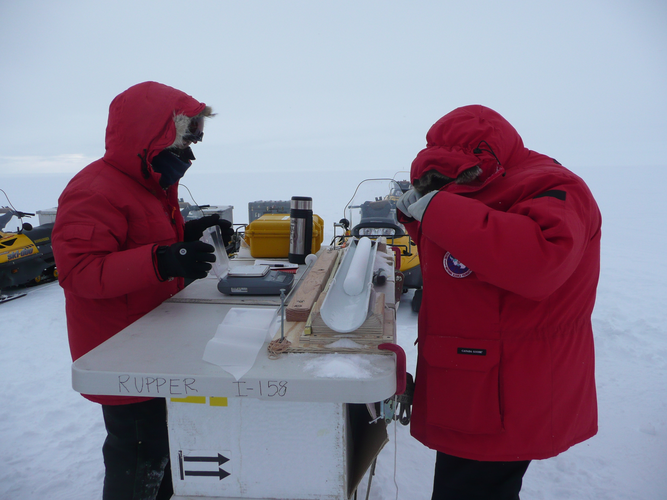 As Ludo was working in the snow pit, Randy started drilling the ice core. He would drill the core and Jessica and Michelle would process it. The core is weighed and measured to calculate its density. The length of the core and the depth of the drill hole are recorded, and the electrical conductivity of the core is measured to detect changes in snow chemistry. The core is then put in a bag, a tube and a box for shipping back to the lab for isotopic analysis. The final depth of the core was 16.8 m (55.1 ft), which will correspond to about 40 years of snow accumulation history.