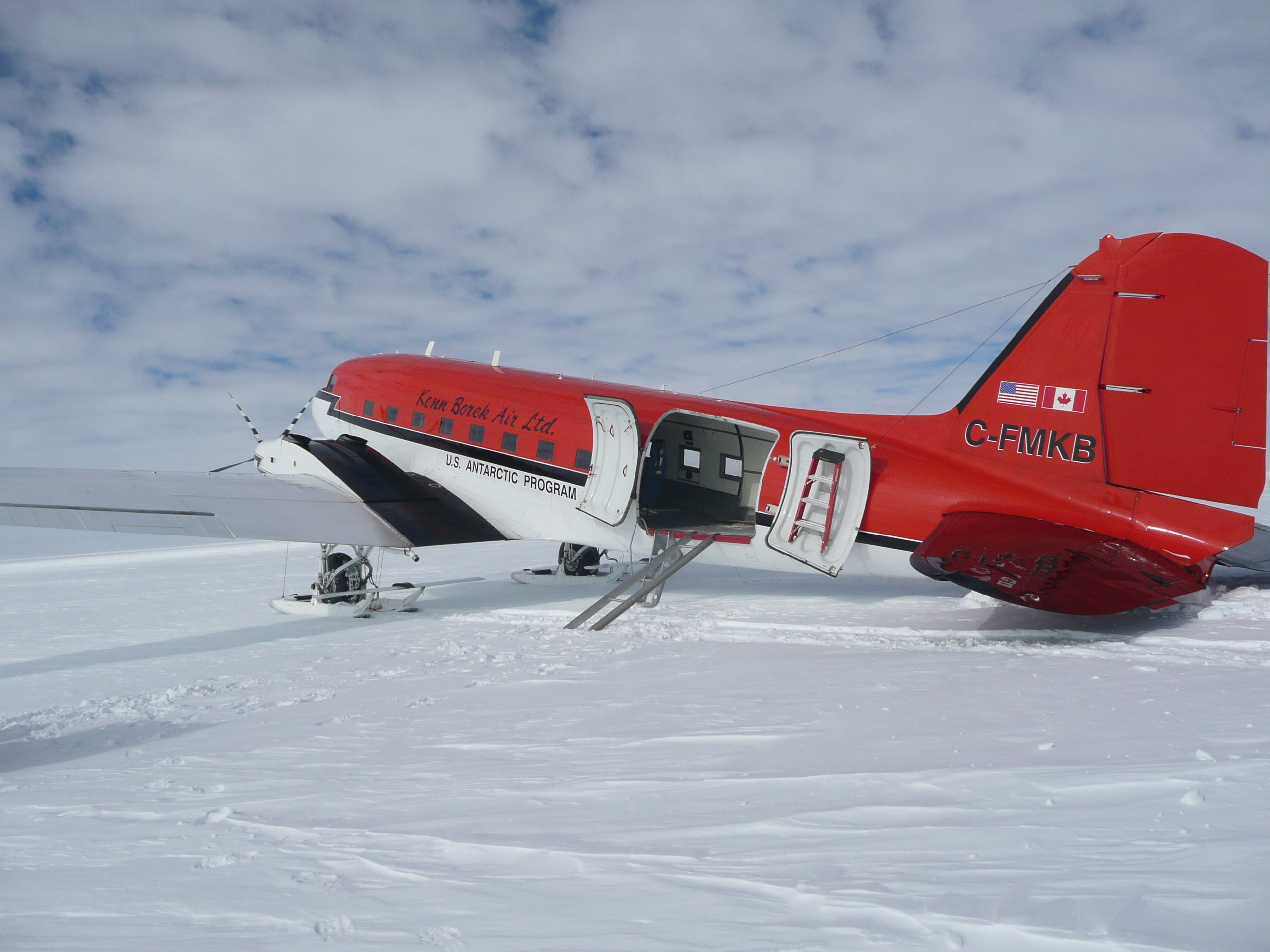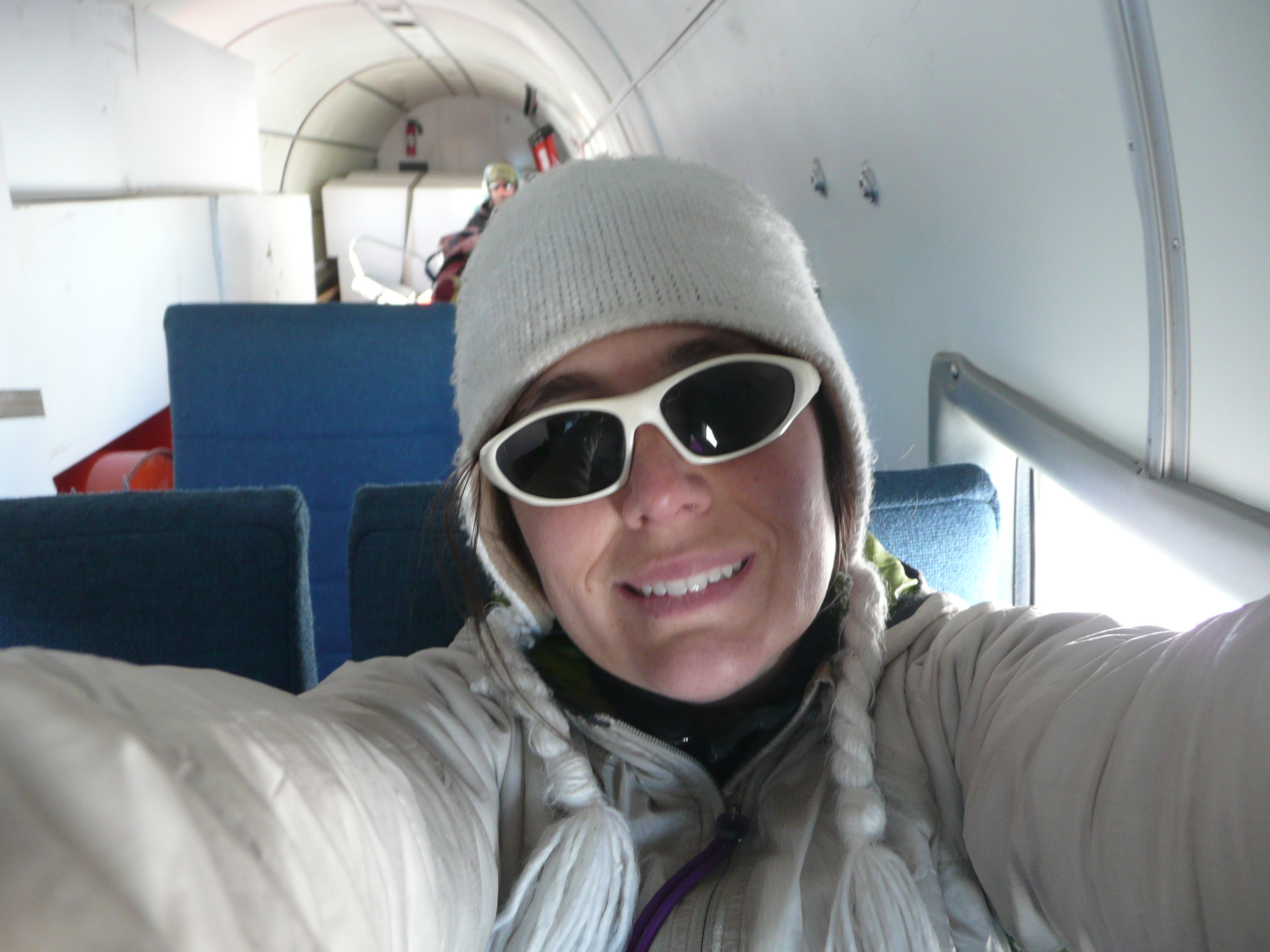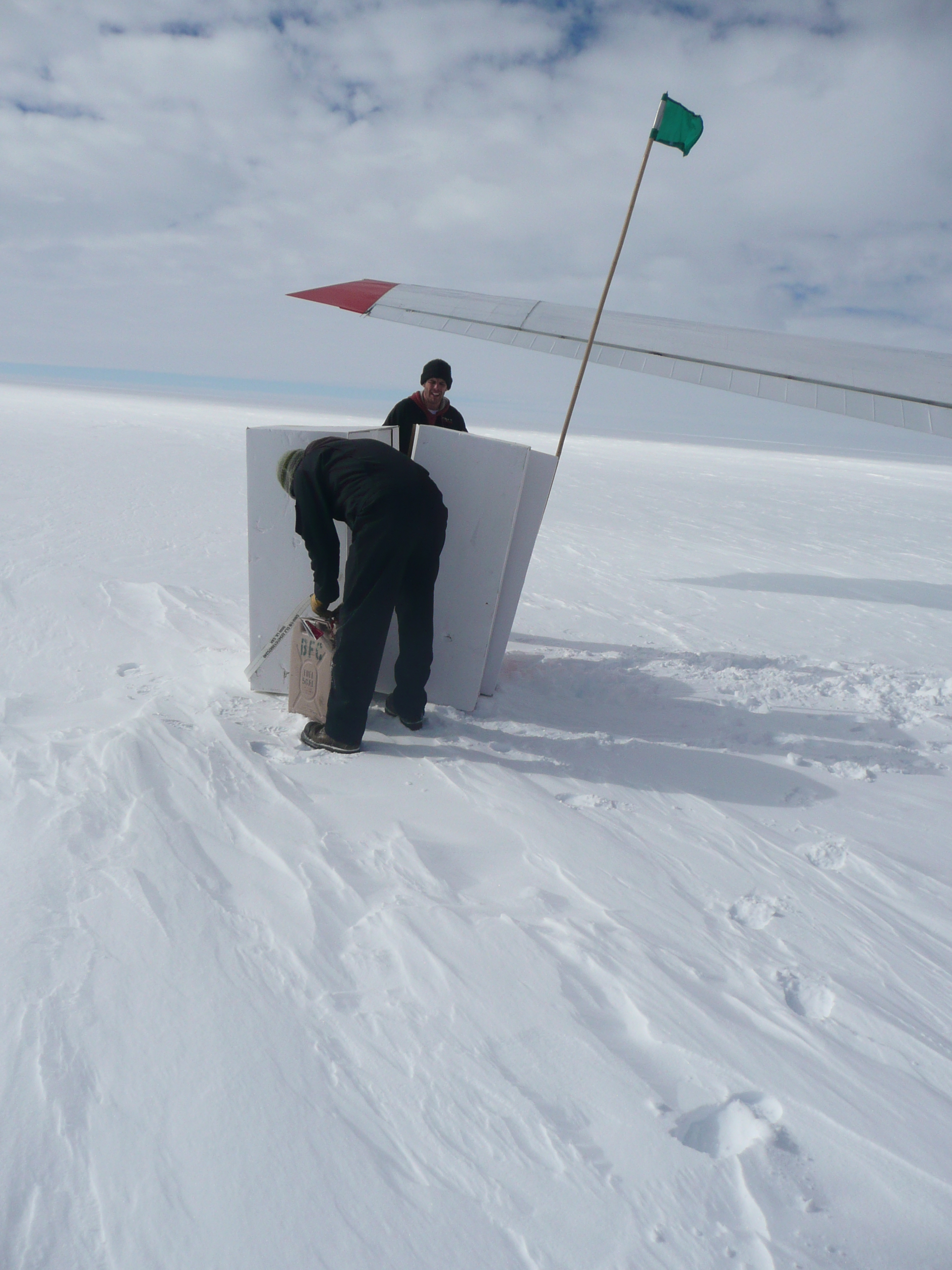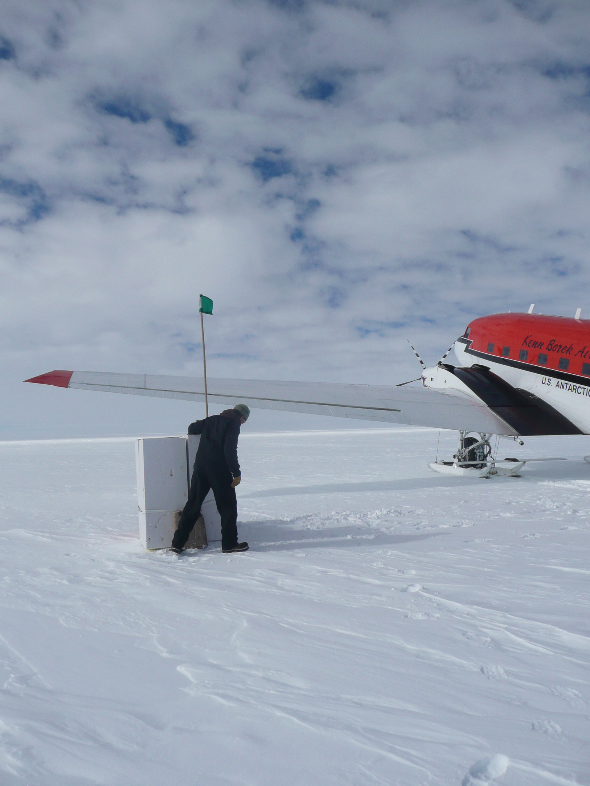 The Bassler took off just before 8 AM. At 8:15 we flew over the traverse team at SEAT Camp 1. I was up in the cockpit so I could see better. Everyone —Michelle, Jessica, Randy, Clem and Ludo— came out of the tents to wave at the plane and the copilot, who was flying the plane at the time, dipped a wing to wave hello. About 15 minutes later, the pilots started looking for a site to land and drop the first cache. The original GPS location did not have good surface definition so we landed about2 km (1.2 mi)  away from the planned camp site. I left the bolts, bread, a note and an ice core box for the team.