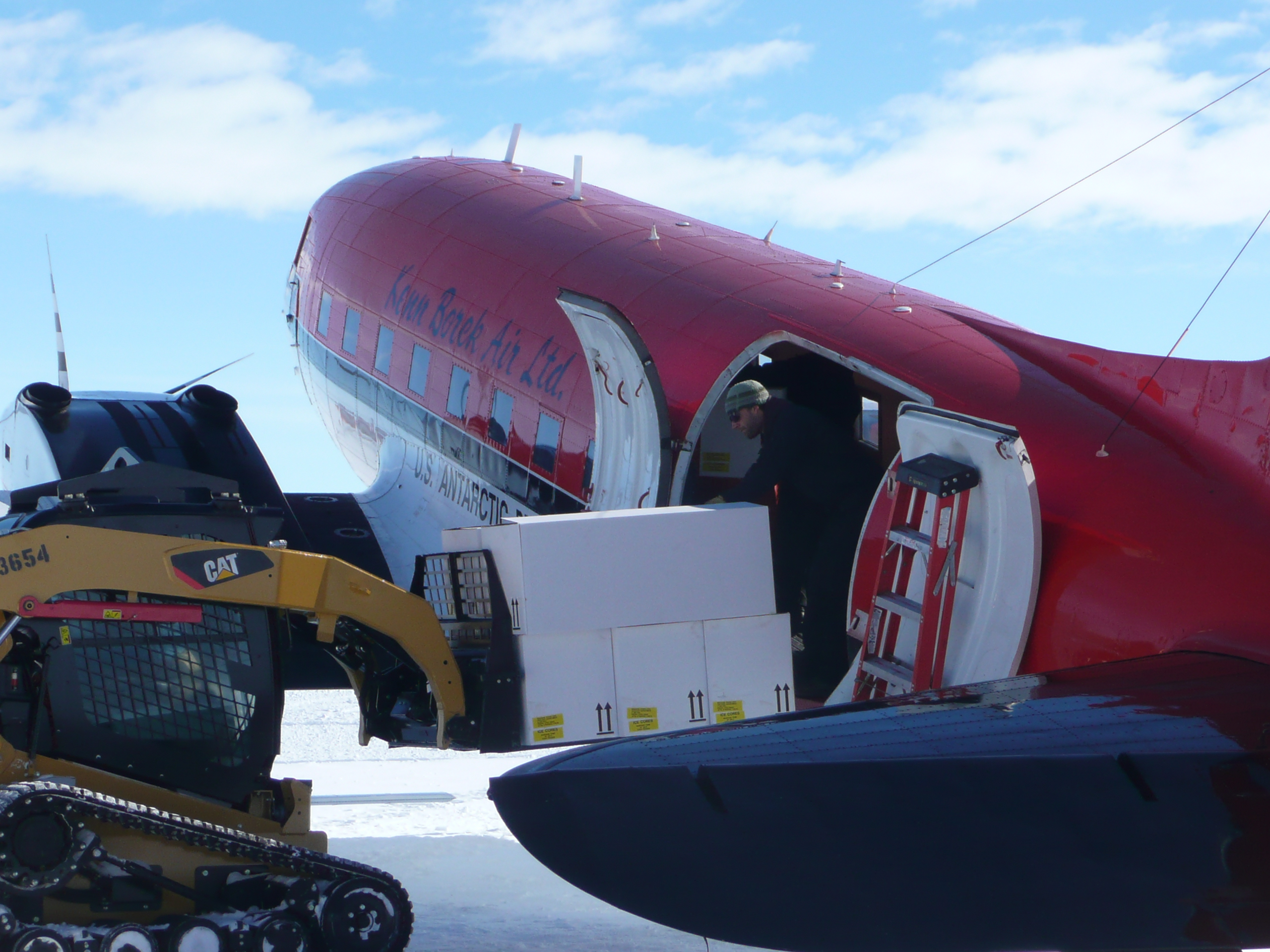 This morning I woke up at Byrd to patches of blue skies. The pilots told me that we would put in the caches if the weather was good enough for flying, so I jumped out of my sleeping bag ready to go. Also, if the weather held, I would catch a late night flight out of Byrd to McMurdo. I quickly packed my sleep kit and duffle so I would be ready to leave if a plane came. I went to the communications tent to talk with the pilots. At 7 AM they were already loading our 55-gallon drums of fuel in the DC-3 Bassler plane, so I knew we were going to try and put in the caches.