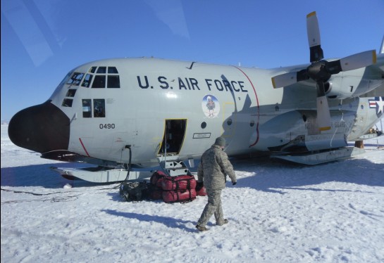 Pre-flighting the second aircraft turned out to be a judicious move. The radio technician identified the problem, but the replacement part was in Christchurch. The scramble began to get our five pallets of cargo off the first airplane and on to the second. We were called from the galley back to the transporter and were driven to the second airplane, so we could get on quickly once the plane was ready. We waited, and waited, and waited, mentally assisting each forklift that grabbed a pallet from the first plane and lined up in order to deposit it on the tail ramp of the second aircraft. Done. Now what? We stared out the windows, trying to interpret the comings and goings of the ground crew. I’ve taken countless Herc flights in my many years here and I have yet to understand all that goes on inside these Hercs as the crew prepares them. Too much time gone already as 10 AM came and went. Doubt started to seep into our once-excited conversations. Finally, the pilot (a large piece of Air National Guard beefcake) came out and tossed the heavy survival bags (the big red ones in the picture) through the crew entrance door. I joked that he was going to load us the same way. Our mood returned to a spirited banter and we rapidly made sure that our bags were zipped up and everything was set. We expected to be called to board any moment.