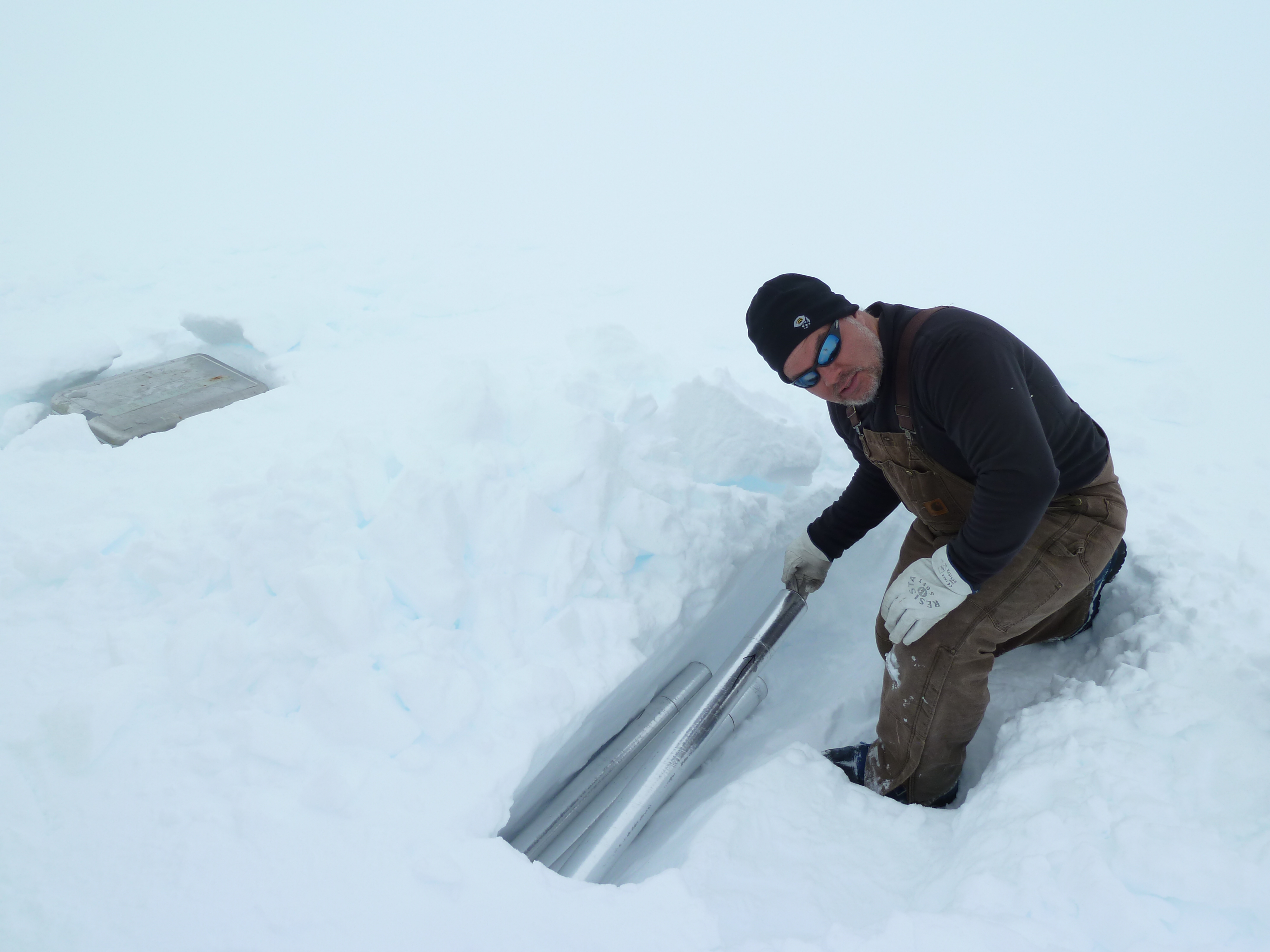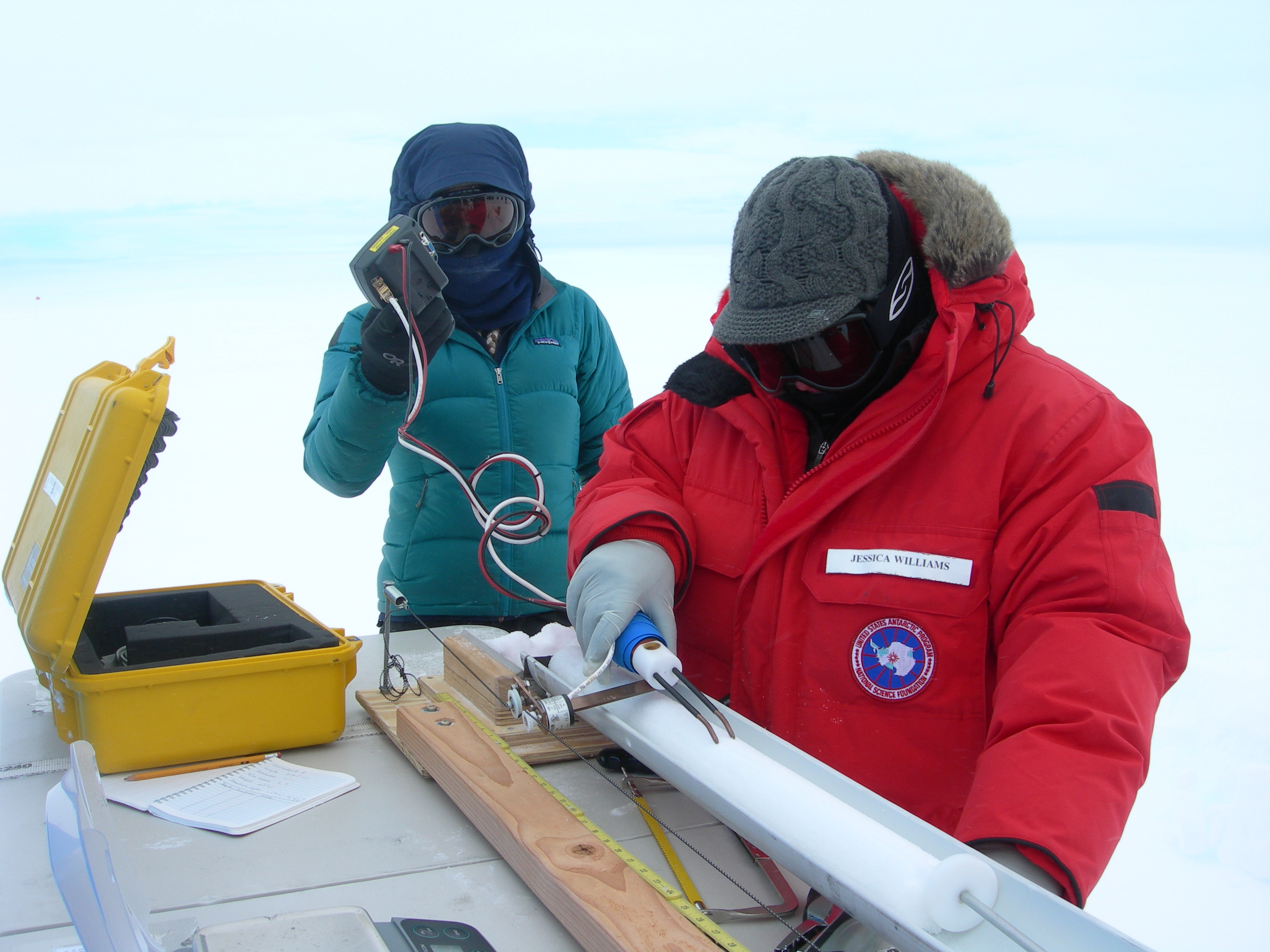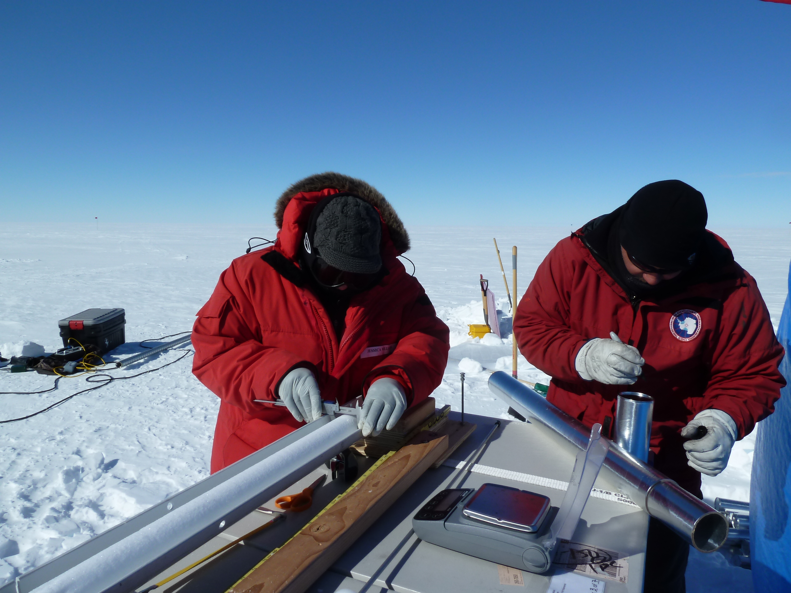 The entire procedure of drilling and processing a firn core takes about six hours when there are three people working together (one drilling, one handling cores, and one recording the data). Randy was the driller, Michelle the handler, and I was the recorder. Once we collect all of the core sections in the tubes, we place them in insulated boxes with the individual bagged samples and a temperature logtag (records the temperature from that point until we get the cores back in the lab several months later – that way we can validate that the cores were well below freezing during the transport). We bury these boxes in a snowpit under a pile of snow to protect them from UV radiation until they are collected and stored into the ice core freezer at the WAIS Divide field camp.