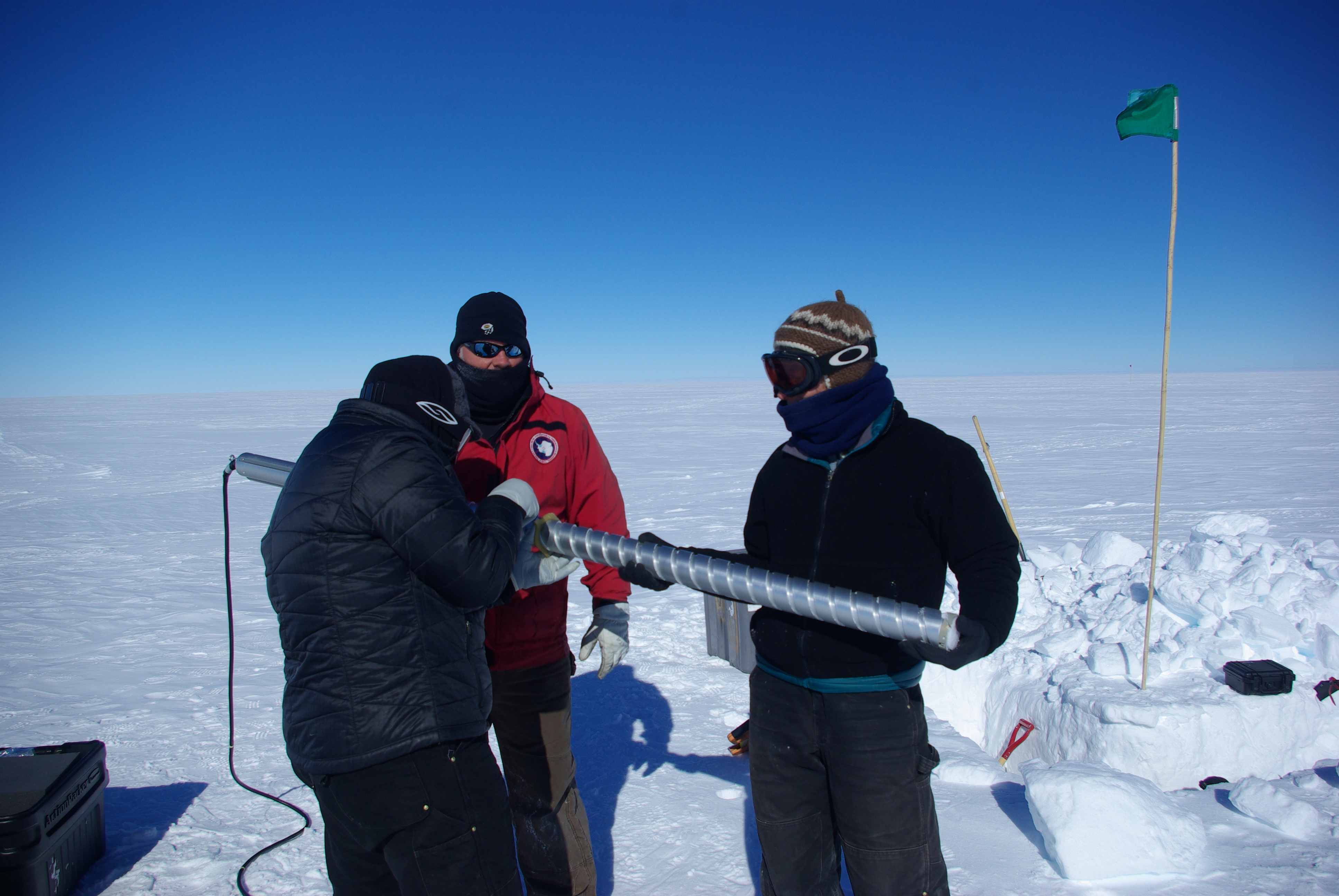 As a reminder to those following the blog, the end goal for drilling the ice/firn cores is to correlate the cores with the layering we see in the radar. (Firn is year-old snow; it’s more compacted than fresh snow but it’s not ice yet.) The radars illuminate layers that can be counted like tree rings, but those layers can sometimes be misleading, recording an individual storm event which is not a complete record of yearly accumulation. We use the physical and chemical properties of the ice core to precisely date the radar layers. Our team collected nine firn cores over a range of low to high accumulation sites this season.