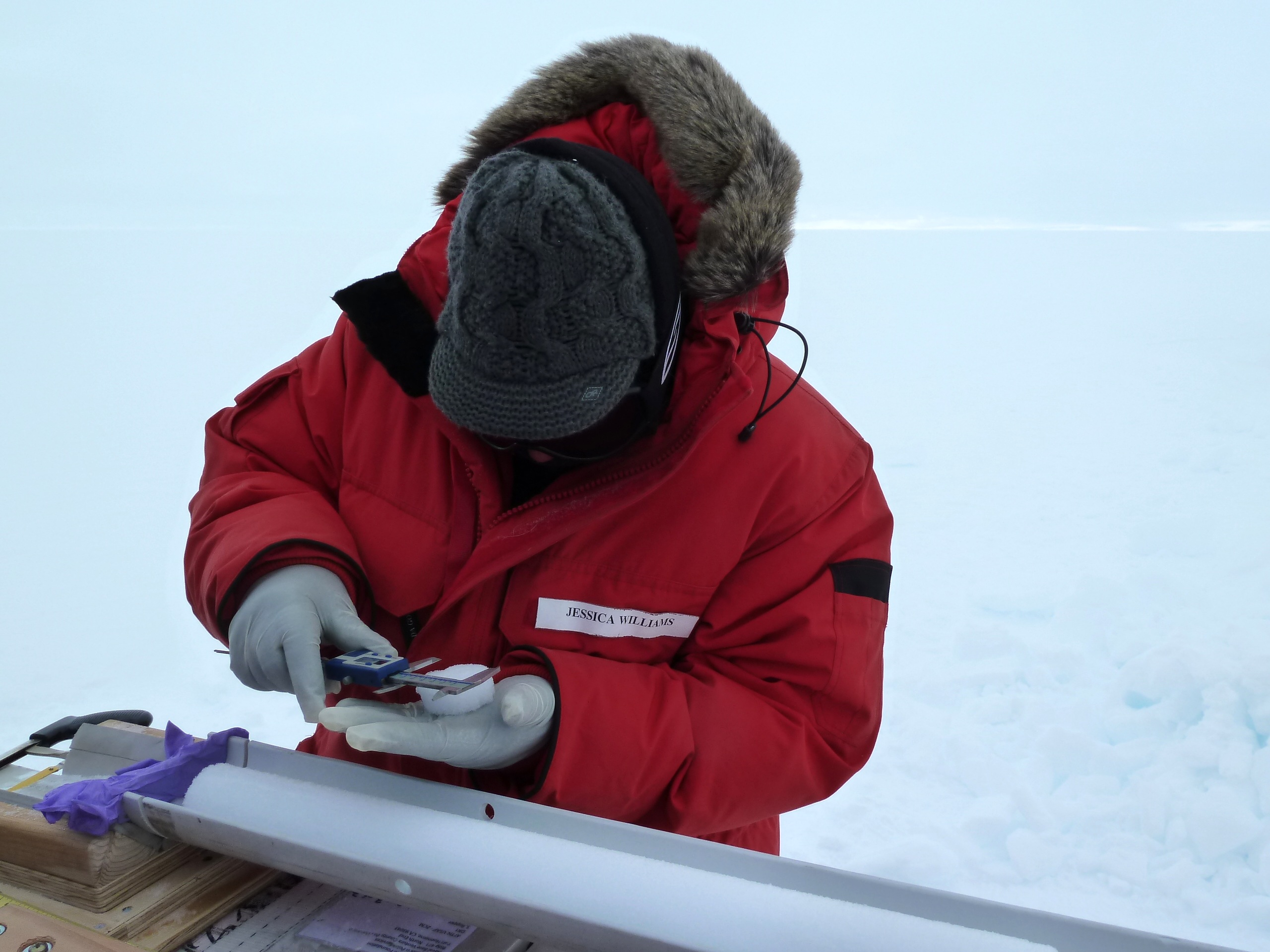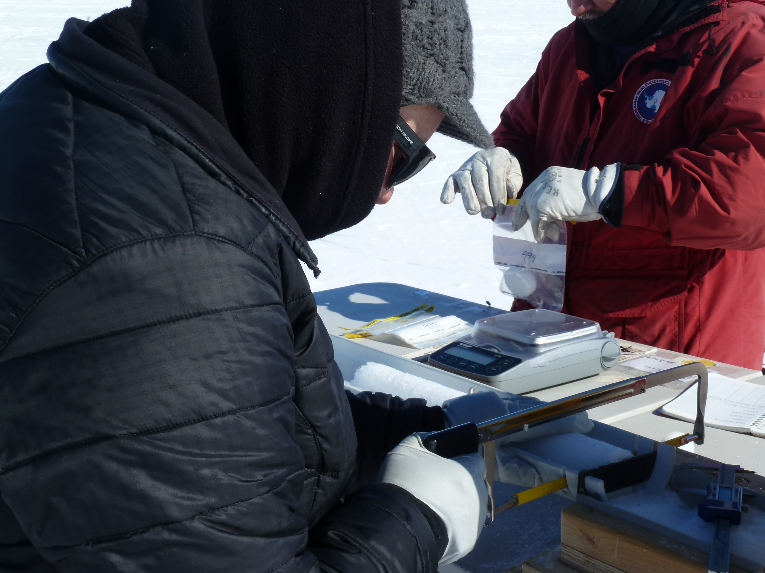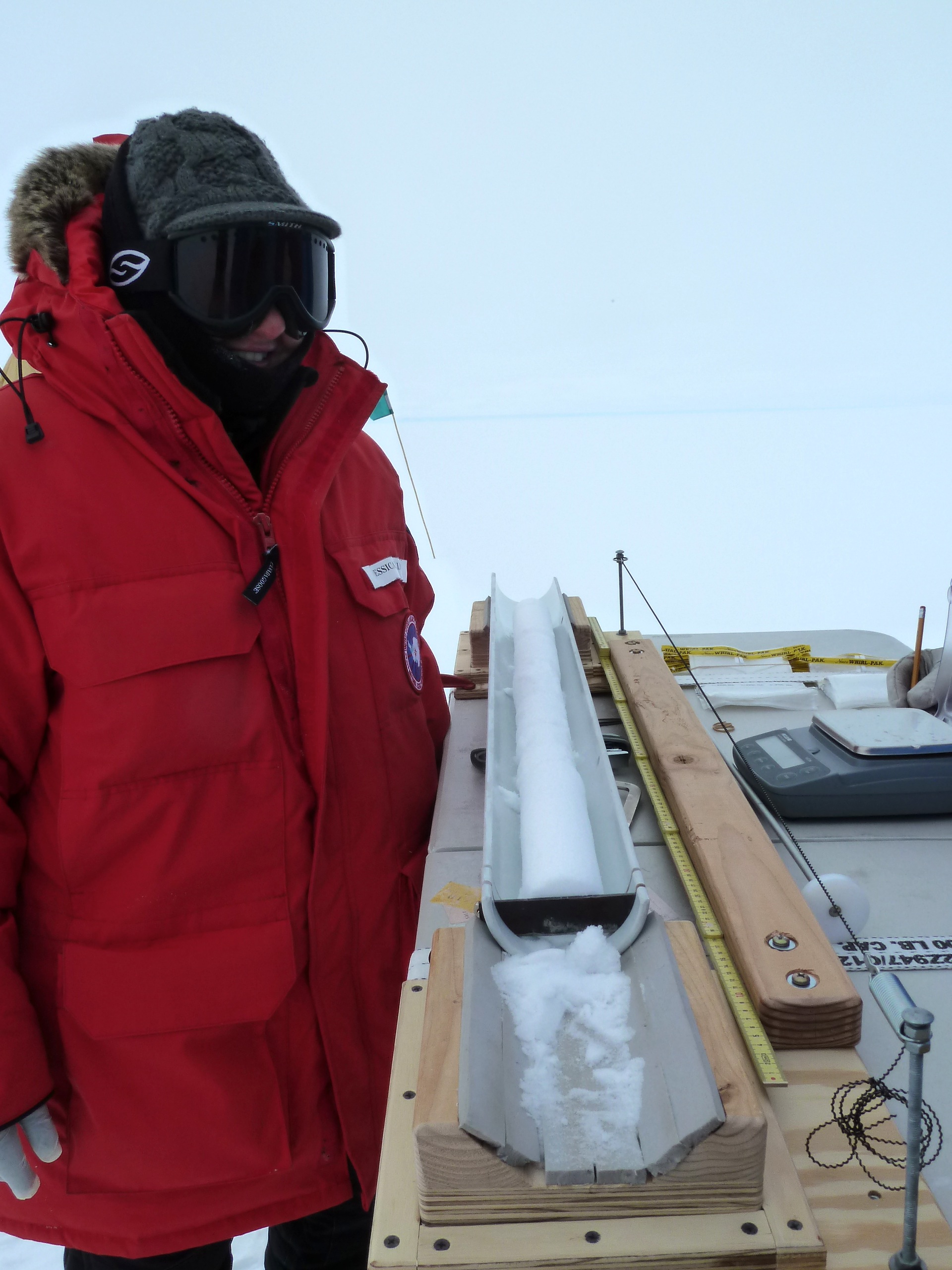 We do some processing of the core sections in the field, and we do it differently depending on how compact the core looks. The upper meters of core are loose and are more prone to break along weaker layers, whereas the deeper the core section, the firmer and less likely to break it is. But every core section needs to have the loose snow shavings brushed off the outside of the core before we measure its bulk weight and length. The length and weight tell us the density of the snow. For the upper meters of core, we do the sampling in the field. We collect electrical conductivity measurements (a measure of the acidity content in the snow) and then we cut the core into 2-centimeter (0.8-inch) thick samples that we then measure for multiple thicknesses and diameters and bag into individual whirl-pak bags (we can measure the weights of these samples in the lab, seeing as they won’t change). Having the thickness, diameter, and weight values for each 2-cm sample is important because we can then calculate density using those parameters (the density of snow increases with depth).