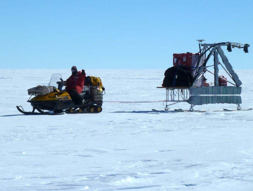 On this sled, beside the radars sitting in the red box, we had packed: a blue bag, two black duffel bags and an orange bag. The blue bag was a survival bag, with all the gear needed in case we would have been caught in a storm; it included a tent, a stove, a shovel, and some food. The two black bags contained Ludo’s and my sleep kits, and the orange bag had some extra food, in case we were stuck for couple days. For the snow mobile, we had a repair kit under the seat to troubleshoot a possible failure. We were carrying two extra cans of gas as well. With this set-up, we were able to get a pretty light sled that was still comfortable and had all the gear we’d need in case of a storm or other circumstance separated us from the rest of the team, who were carrying all the camp gear. Fortunately, this never happened!