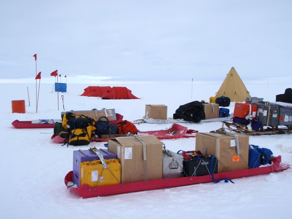But now, let’s go back to the survey. The travelling days were the ones where the team was the most vulnerable: while we were traveling we had no shelters or camp set up to get back to if anything went wrong because we had to break down the entire camp in the morning, pack all gear on the sleds and ride with the snowmobiles pulling the sleds to the next camp. After driving between 50-90 km (31-56 mi), we would build our new camp, usually that same day in the afternoon. We had a total of seven travel days, covering a distance of about 500 km (310 mi).