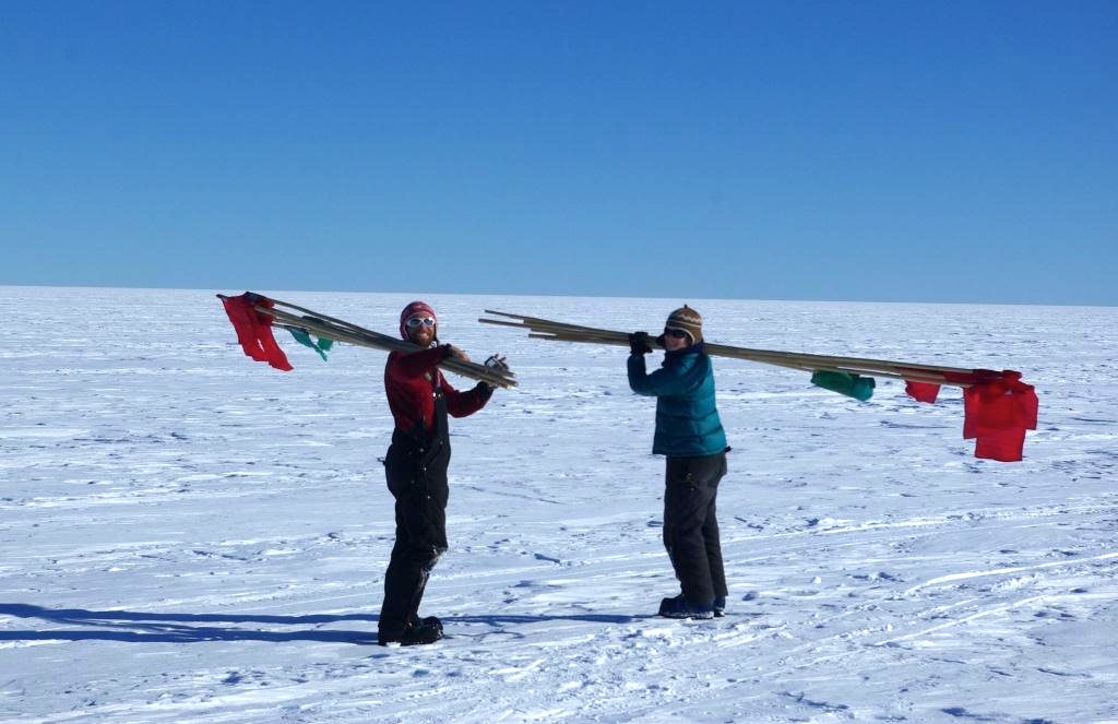 The days we were at camp, we did some small radar surveys: a bowtie and a grid around the core site. To help us drive the snowmobile straight for the grids, we set up flags to visualize the corners and sides. In the deep field, everything is white and flat, so it is hard to maintain a nice bearing just by following the GPS for such a small grid.