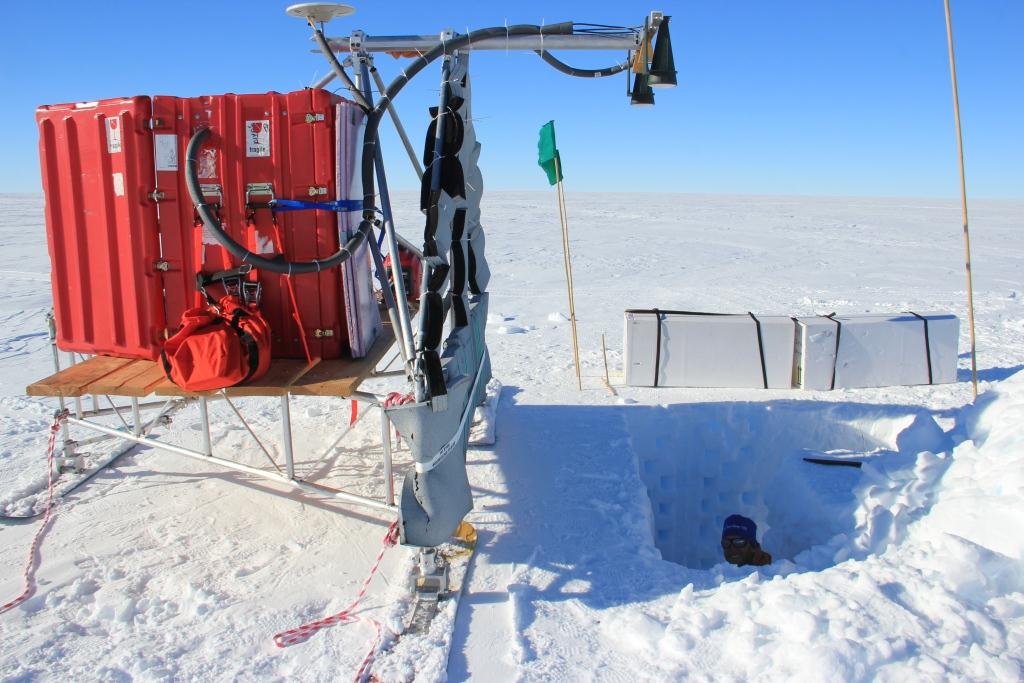 Hi there! After more than three weeks spent in the field, our team is very happy to be finally back, with many memories of the traverse. This year has been a very intense experience and I would like to tell you a little more about this expedition. I will focus on the days we were doing radar surveys. Indeed, two different studies were set up during this field work. The first one was during the traverse days, where we did a radar survey from one camp to another with a range of 50-90 kilometers (31-56 miles) between the camps. On the other days the surveys were smaller, set up around each camp; they consisted of a 10-km bowtie and a 280- by 280-meter (918- by 918-ft) grid to get a better idea of the spatial variability of snow layer depth surrounding each core site. These grid surveys will show us how representative the ice core is compared to the surrounding area and help answer the question of whether we would have gotten a different result if we had drilled our ice core a few paces this way or a few paces that way. We were also looking more in detail at the layering in a 2-meter (6.56-ft) snow pit; to do that, we were using a metal plate at different depths of the snow pit.