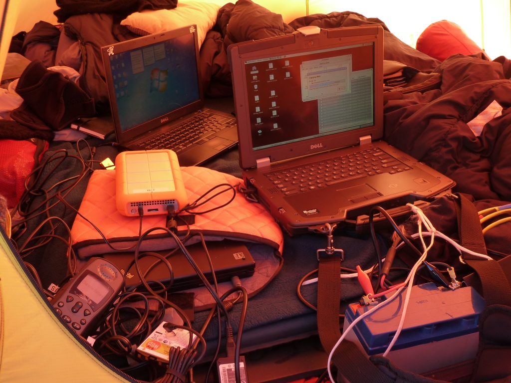 Both radars looked at the first 20 meters of the snow pack, sending electromagnetic waves into the snow. The snow radar (the big green horns in the picture) operates in a frequency range of 2-8 GHz. The other radar (the smaller brown horns) is the ku-band radar, sweeping between 12 to 18 GHz. The lower the frequency, the deeper the radars look. We have both radars for some redundancy in the system, imaging the snow/firn closest to the surface, which we core twice, and then the snow radar peers deeper than the cores to provide literally a deeper look. In addition to the 2 radars, we needed to know the elevation we were at, which is important for comparison with airborne data and also for modeling precipitation and temperatures. For that, we simultaneously collected GPS coordinates, which gave us our exact latitude, longitude and elevation every 5 seconds. The GPS antenna was on the very top of the sled, about 2.5 meters (8.2 feet) high.