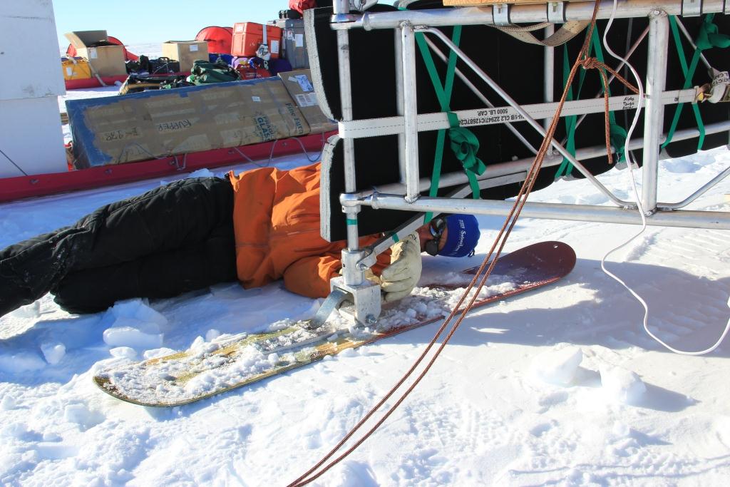 During travel days, the radar team left camp first, mostly because we had to drive at low speed to ensure the radar’s safety. Indeed, on the days we ran into large sastrugi (small ridges of hard snow), we drove at less than 10 km/h (6.2 mph). These sastrugi made our travel a little bit more difficult. Toward the end of the day, the team responsible for breaking down camp would leave the radar team and go 20 km (12 mi) ahead, to start setting up the new camp.