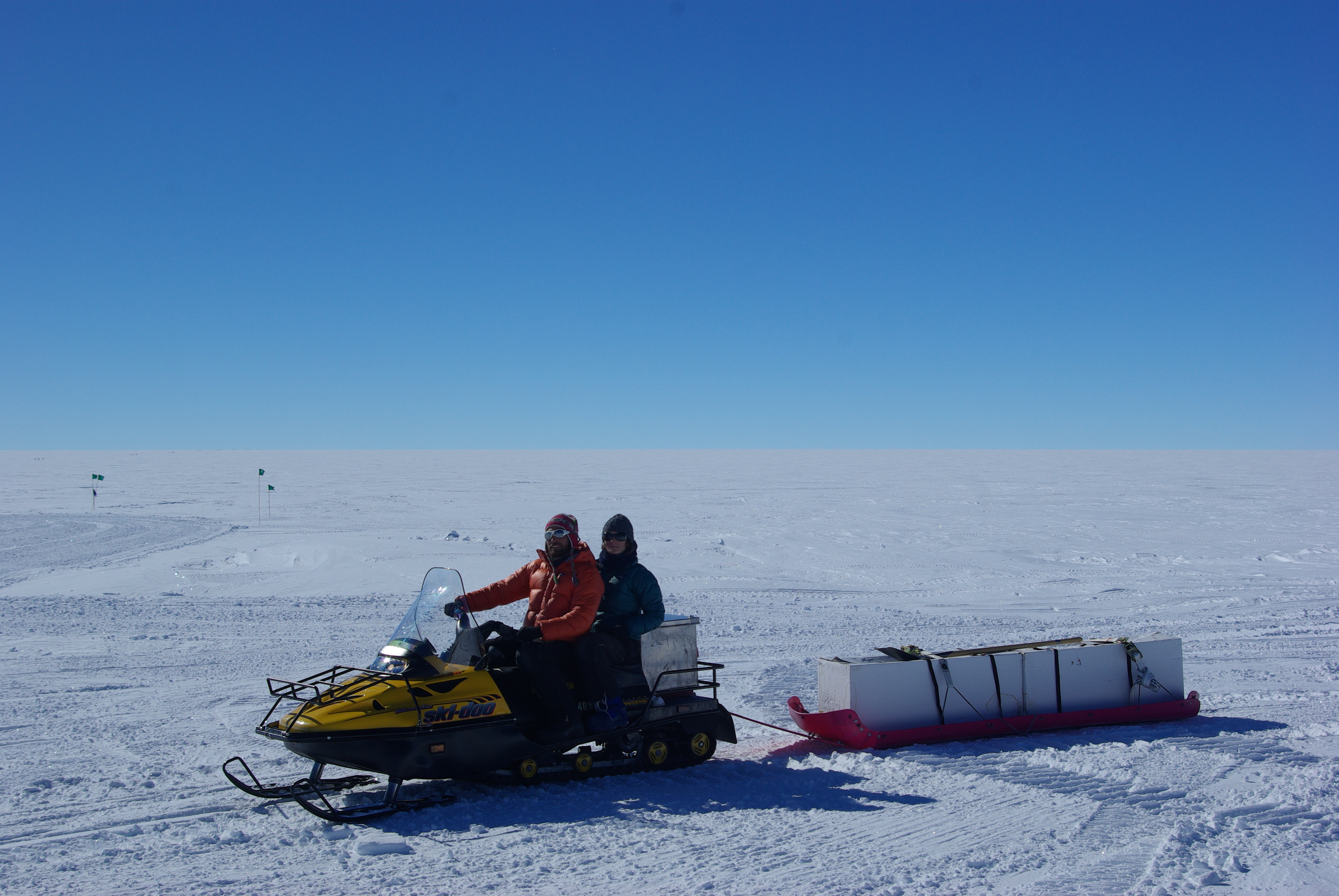 The half hour gave us some time to drive 3 kilometers (1.86 miles) out of Byrd to dig out the first 18 core segments (each one of them about one meter, or 3.3 feet, in length) we had drilled three weeks before. Randy and I jumped on a snowmobile and headed there, while Michelle and Clement attached a sled to their snowmobiles to bring the cores to the plane, and joined us a few minutes later. We had to drive very slowly to make sure the cores didn’t get damaged during the ride.