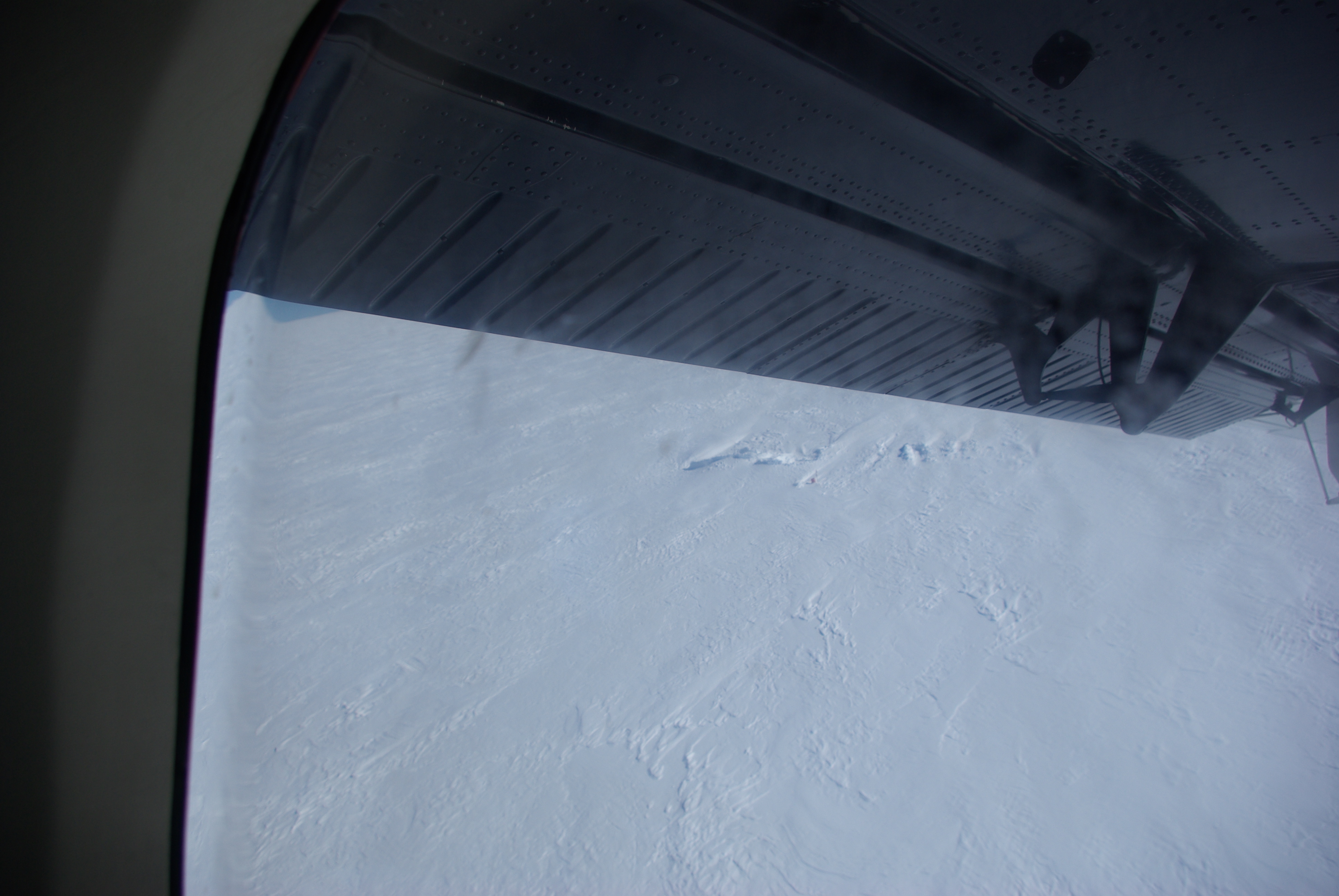 Between each site, we flew at low elevation (100 m). It was incredible to see some of our traverse legs from above, and even though we had encountered some pretty breezy days during the previous weeks, it was still possible to see our snowmobile tracks in some places.