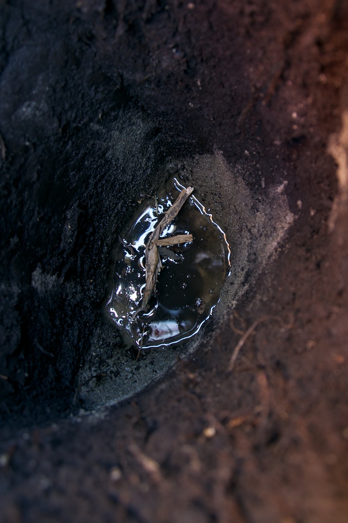 Example of a typical soil profile: Litter (not shown), then organic layer (brownish orange layer), then soil (gray-colored layer), and then groundwater.