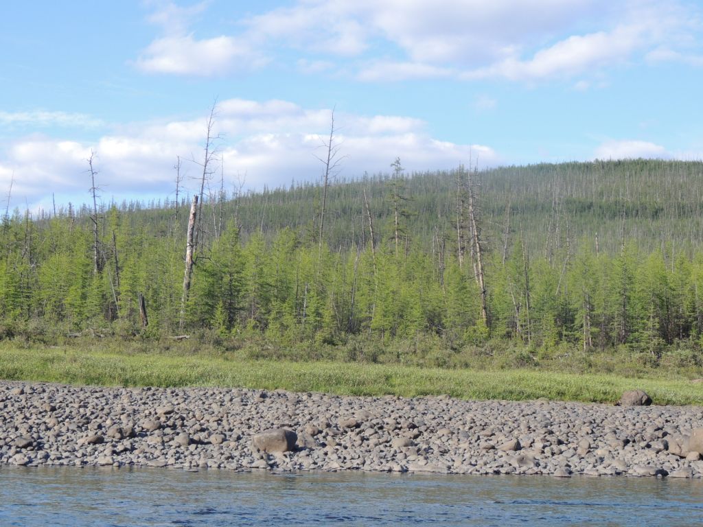 We actually are seeing a lot of these spots along the river – areas with lots of big trees surrounded by heavy larch regeneration. So this area definitely has burned in years passed, but not very recently. The new trees look young and small, but it takes a long time for them to grow in this area, with the cold and harsh winters. Near our campsite, the new trees look pretty small, but we are estimating they are at least 60 years old. As the climate warms, however, we expect to see the regeneration grow more quickly. It’s been warming in this area for the last several decades, so we have to be a bit cautious in our age estimations. We’ll confirm the age by counting growth rings on the samples Slava has collected.