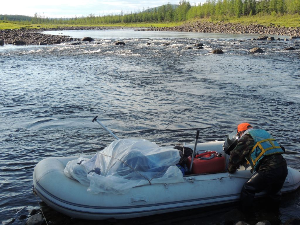 We fought the river again today, but in the end, we have been successful. We’re now tucked away in camps – the one we wanted to reach yesterday. Again, our trip was a long struggle against the shallows and small rapids. Each spot is about 50 to 100 feet long, and filled with rocks. To get around them, we have to get out and pull the boat. Slava calls these rocky ripples “dragon’s teeth”, because they are sharp and will eat our boats if we let them. We’ve been careful, but the bottom of our boats have suffered, anyway.