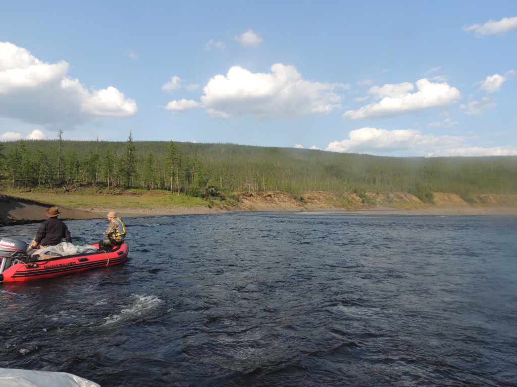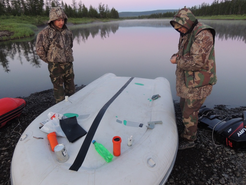The Embenchime River is running a little higher now, due to recent rains and the inflow from a few small tributaries. The river still holds shallow areas and “dragon’s teeth” – sharp rocks – that must be passed over. Each night Sergei and Pasha pull the boats out of the water and repair the damage, in preparation for the next day’s journey.