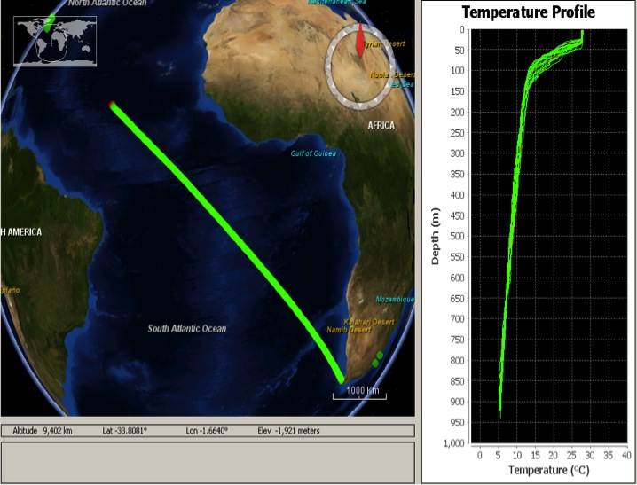 AOML started a new XBT transect between Cape Town and New York City (referred as AX08) on August 18, with XBTs deployed every 15.5 miles (25 kilometers). This is the third of five AX08 realizations that will be done on 2012. There are five realizations planned for 2013. A total of 550 XBTs are deployed on each realization.
