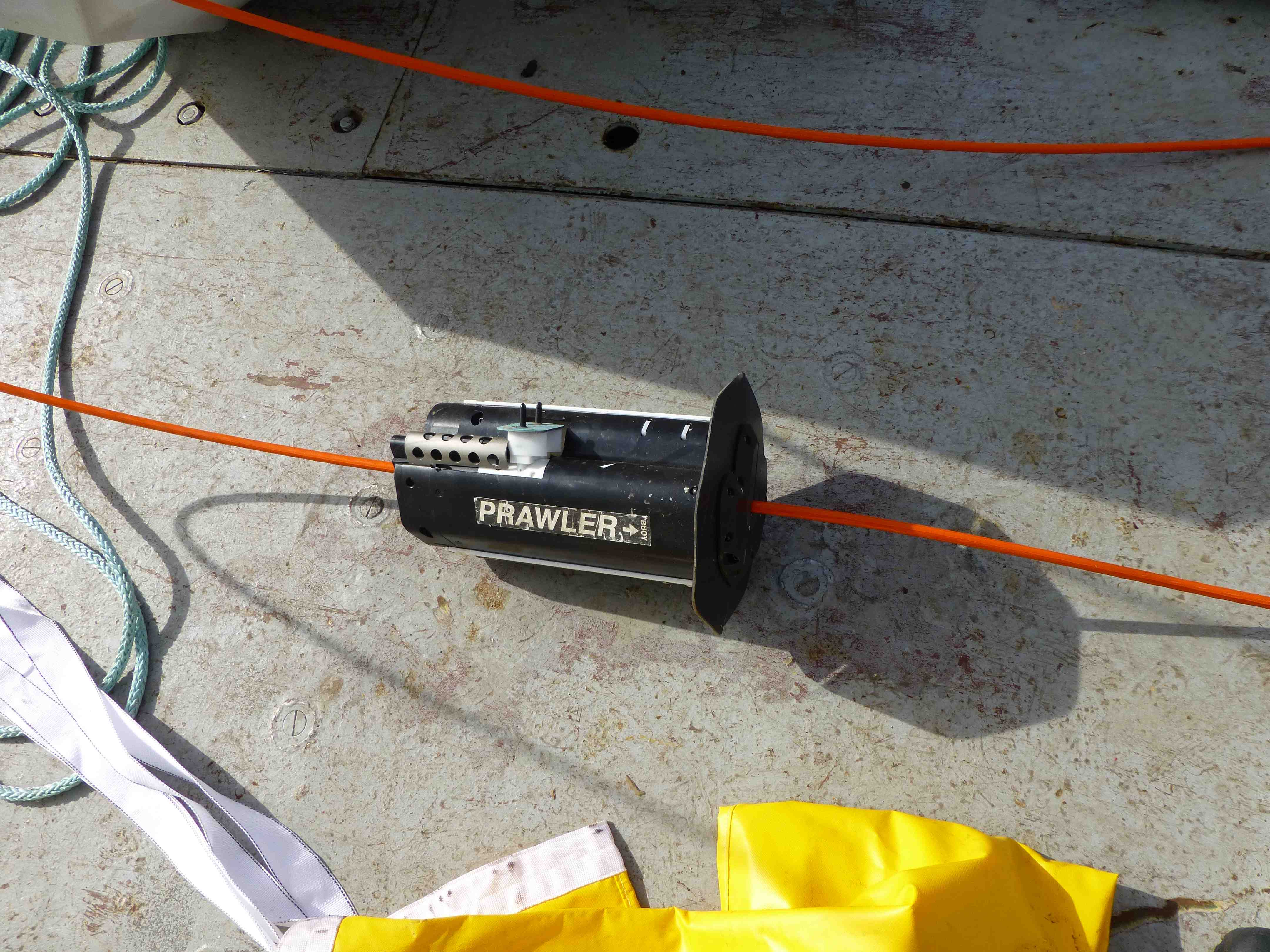 It’s very exciting for us to help PMEL by deploying two of their “Prawler” (Profiling Crawler) moorings in SPURS. The Prawler uses the motion of the waves to provide lift for free: each time a wave lifts the mooring, the instrument holds tight to the wire with a ratchet and goes up. When the wave trough passes, the ratchet releases and the round fin keeps it from going down, so it “crawls” up the wire in steps. When it gets to the top, it free-falls back down the wire, making a profile of temperature and salinity. Since battery power is one of the main limiting factors in designing ocean instruments, the Prawler’s use of wave energy lets it work for much longer than if it had to carry a large battery pack and motor. A full and fascinating description is available here.