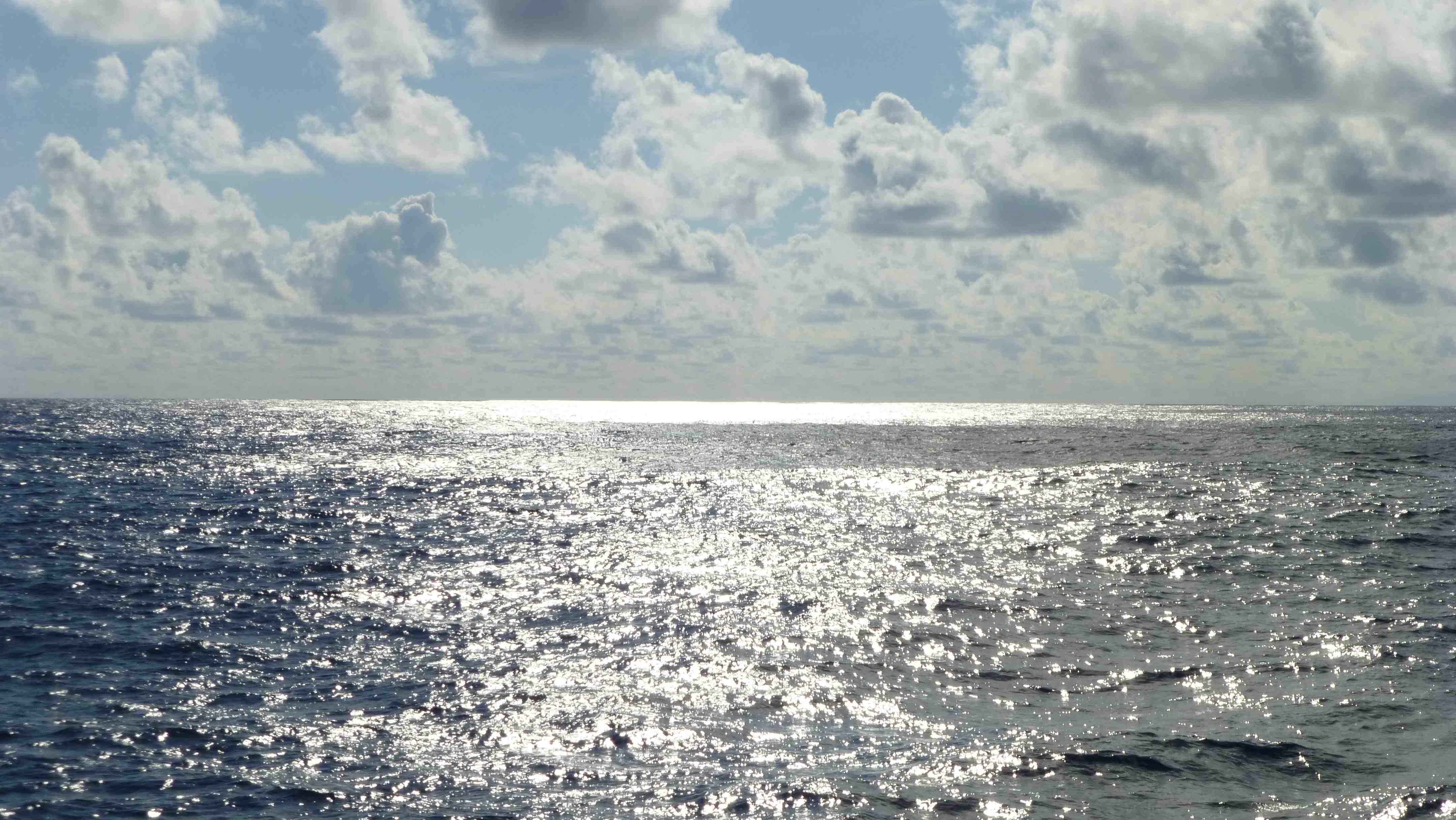 We are working in what is called the trade winds zone. It is a belt of generally east and northeast winds north of the equator and east or southeast winds south of the equator that are quite steady and global in extent (in the days of sail, one’s trade depended on using routes through these reliable wind zones). In the trades zone, we might expect relatively steady 10-15 mph winds and fair skies with broken clouds. One characteristic of the fair weather cumulus clouds in the trades is that they lean over because of wind shear in the atmosphere. The blue sky dominates the evenly scattered puffy white leaning clouds that seem to all have the same base (maybe 3,000 feet above the sea).