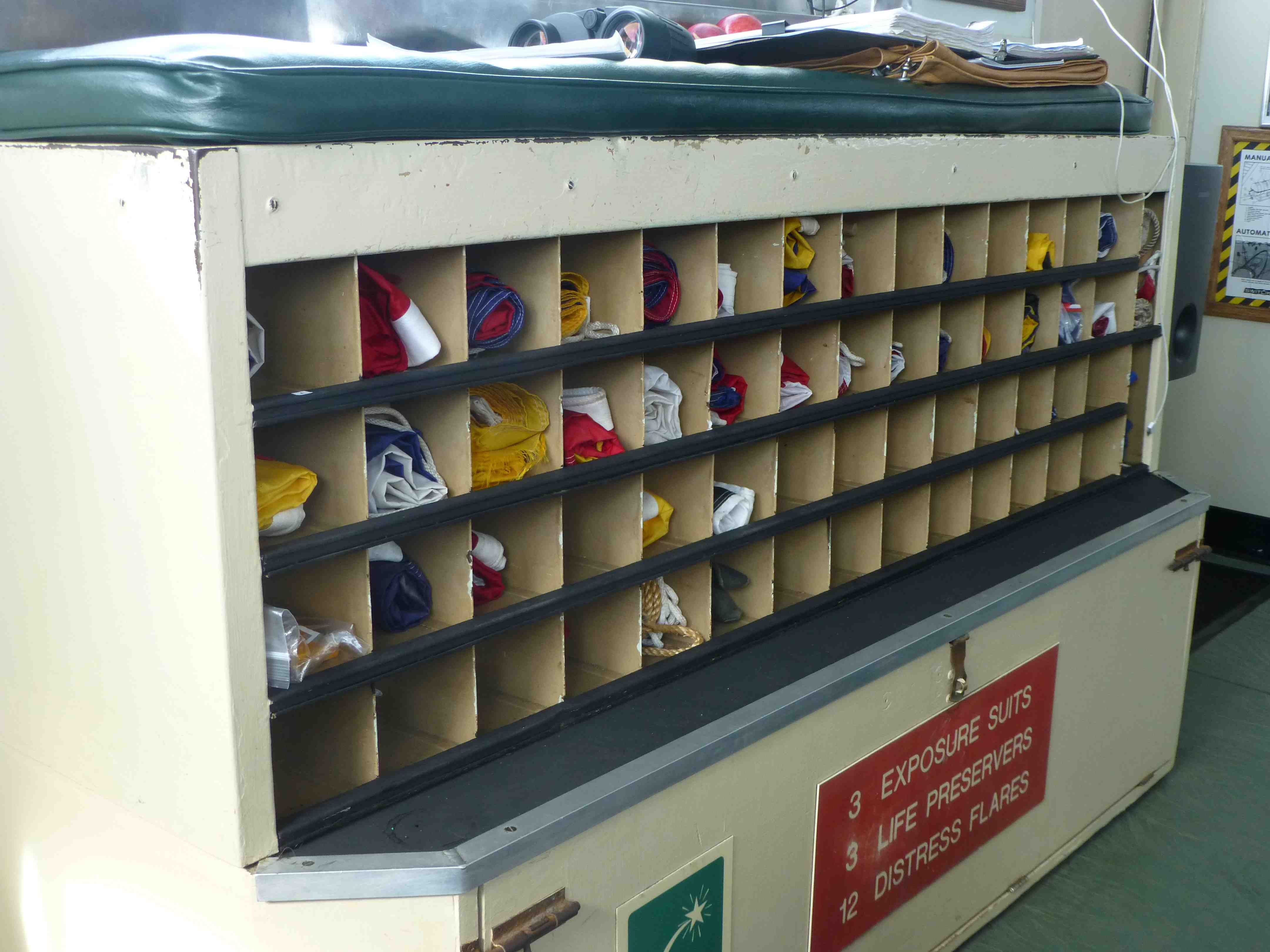 The Knorr has enormous capability for communication – via satellite phone or internet or radio. In close quarters with foreign vessels, Knorr can communicate the old-fashioned way via flags. Sequences of brightly colored flags have universal meanings to mariners.