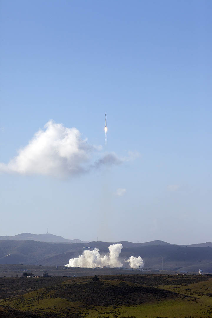 Cheers erupted at 10:02 a.m. from the hundreds of people gathered there as the rocket rose, gathered itself, then surged into a perfect blue sky over Vandenberg Air Force Base. As the cheers subsided, it was surprisingly quiet for a moment as awe sank in, save for the patter of scores of cameras clicking in unison.
