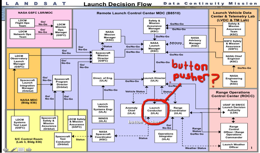Technically, LDCM Project Manager Ken Schwer said that there isn’t a button. He said nobody pushes the button—a computer system runs the launch sequence and there’s a chart that shows how everything works. I ask him to send it to me to help out my search (see above).