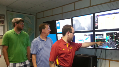 - Iowa State University Forecasters Dr. William Gallus (middle) and Graduate Assistants Brian Squitieri (right) and Ben Moser (left) evaluating storms in real time and determining the areas that might be at greatest risk for experiencing flooding conditions and severe weather. Credit: Iowa State University