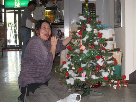Lou wasn’t hard to find. He was in the hotel lobby with Midori Asou, the owner of the Sun Pearl who was opening boxes of Christmas ornaments and putting him to work decorating the small trees set around the entrance. The Sun Pearl lobby was already a riot of decorations, most of them space related. Models of Japanese rockets stand on the reception desk, and a stuffed HII-A, GPM’s launch vehicle, hangs from the overhang with the GPM water cycle card hanging below. On the far wall are more than a dozen mission stickers, including one for GPM, one for its predecessor mission the Tropical Rainfall Measuring Mission, and one for GCOM-W1, a JAXA rain and climate mission that will contribute data to the GPM mission’s global data products.