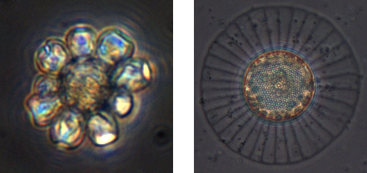 The specific chemical processes carried out by phytoplankton still need to be determined and studied. This is a microscopic picture of a coccolithophore (left). Diatoms (right) form silica shells. The reason behind this is still to be determined. One theory relates to protection from predators. SOI/ Colleen Durkin